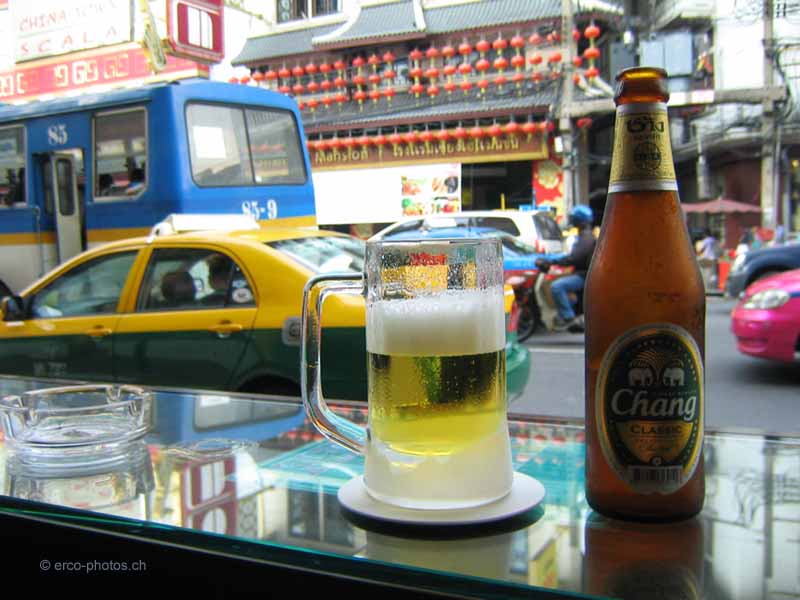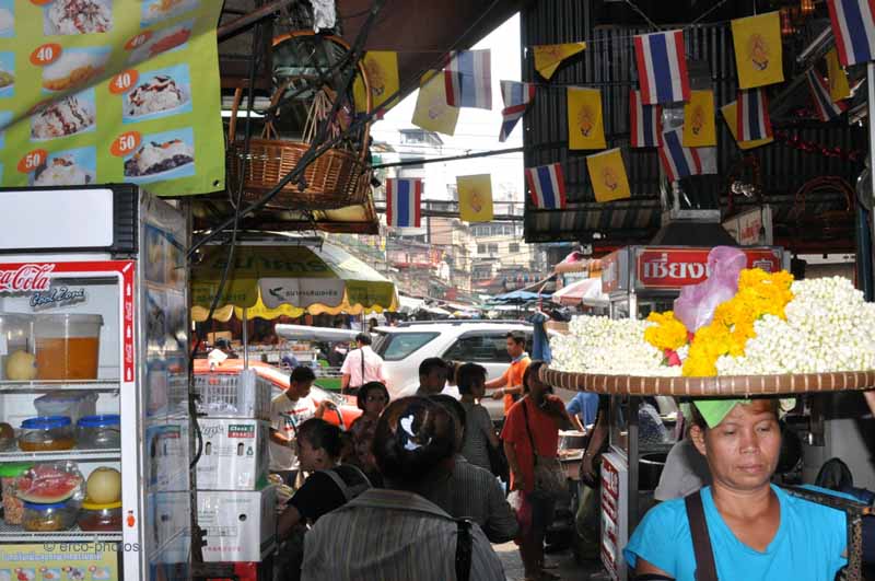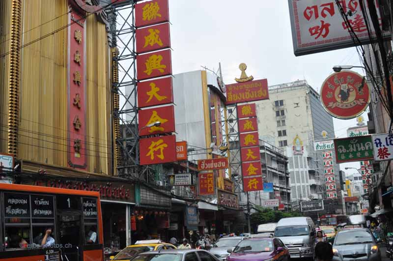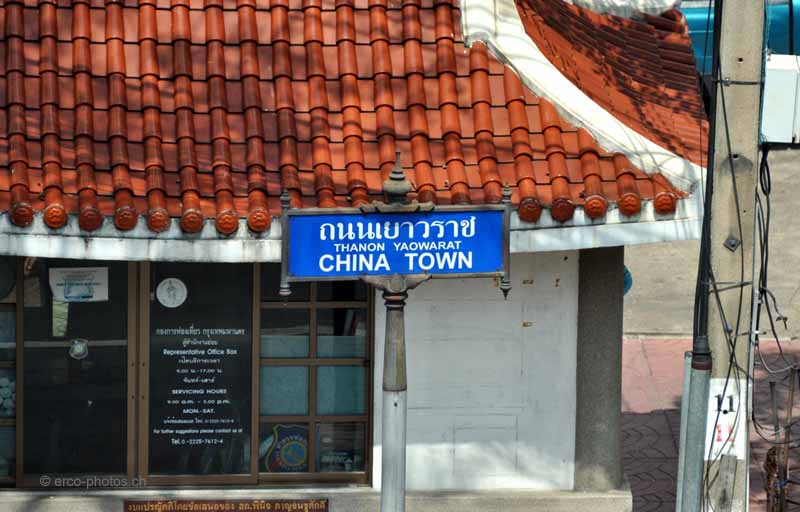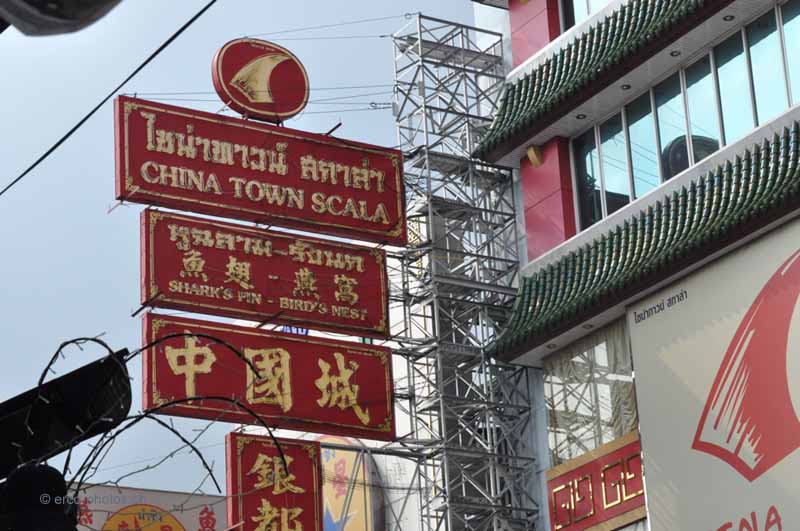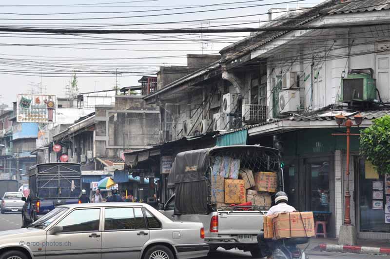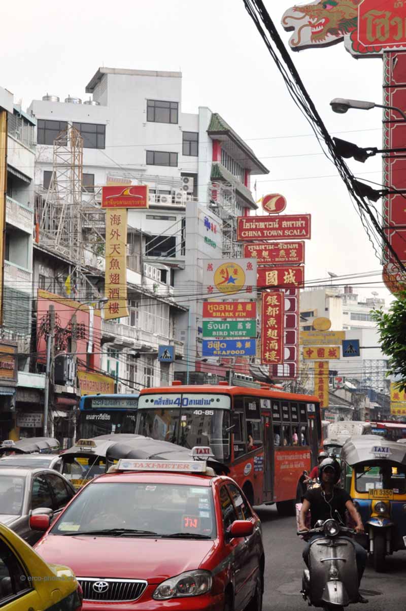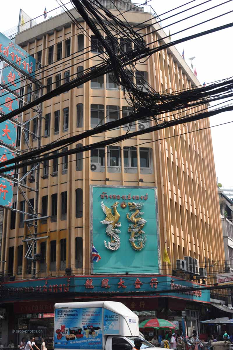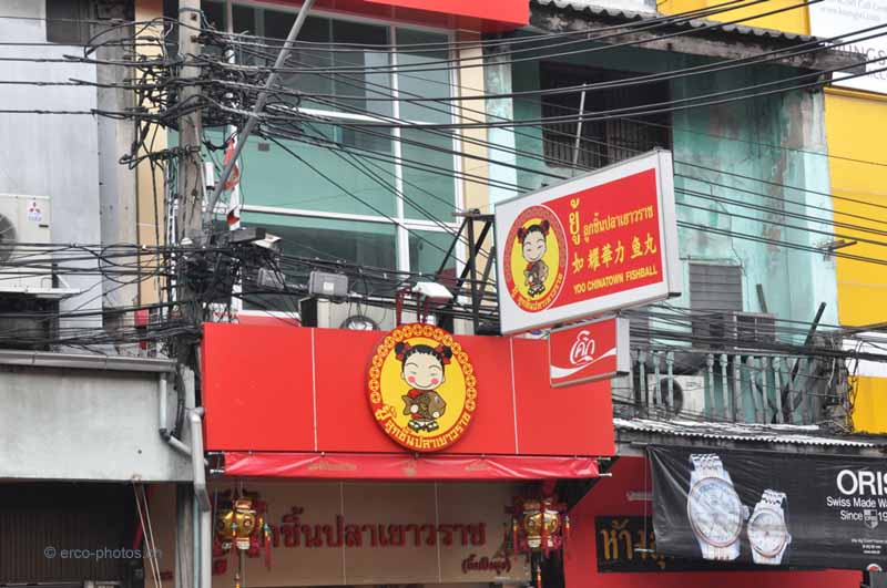 Après ma ballade sur le fleuve et ne pouvant pas visiter le Palais royal (je n'avais pas d'invitation - Un oubli peut-être? - pour une cérémonie de je ne sais quelle commémoration). Je me suis rabattu sur China Town. Bien que pour nous l'Asie c'est l'Asie, quand vous entrez dans le quartier chinois vous avez vraiment l'impression d'avoir changé de pays. L'écriture sur les enseignes de magasins, la marchandise qui s'y vend, la nourriture préparée par les petits cuistots des rues, l'architecture des temples, tout est différent. Seuls le brouhaha et la circulation sont identiques. Ah! et j'oubliais... les fils électriques également.