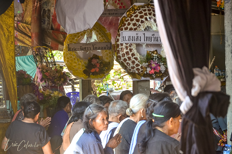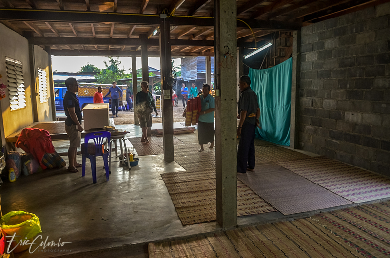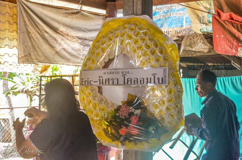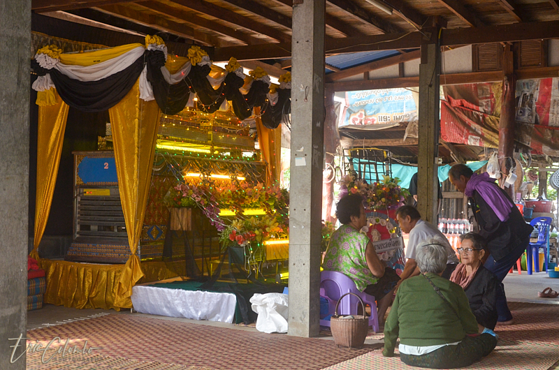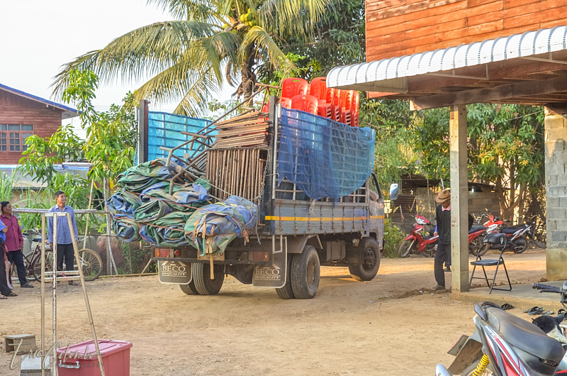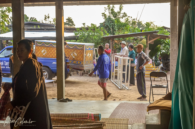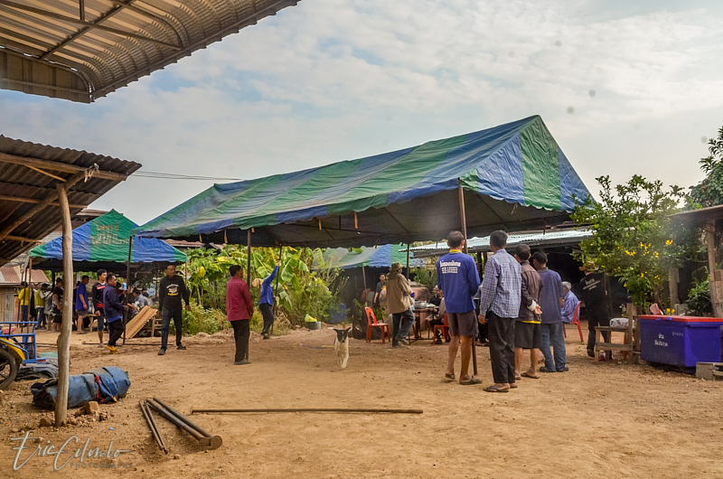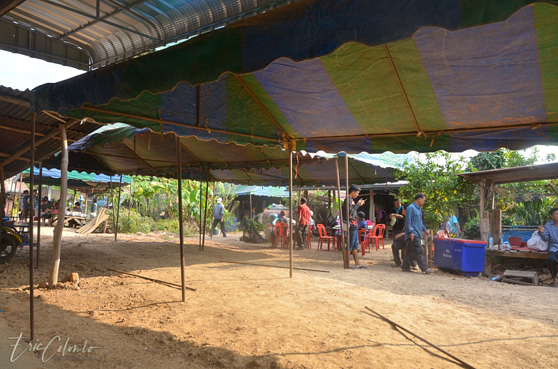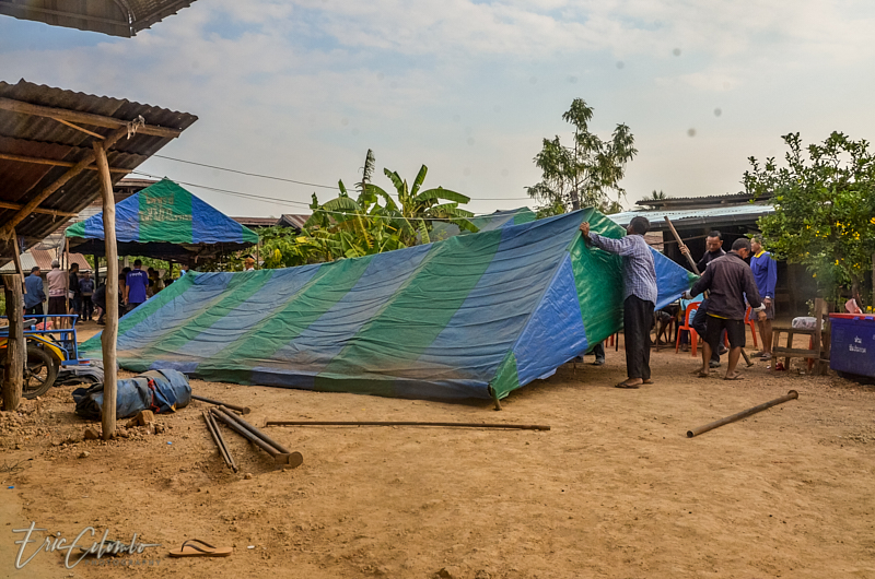 A l'extérieur, 7 ou 8 cantines sont installées et garnies de chaises et tables pour accueillir et nourrir les parents et amis qui viendront, au fil des jours, se recueillir et encenser le sarcophage et présenter leur cadeaux (riz, argent, couronne, etc) à la famille et aux moines qui seront là tous les soirs.