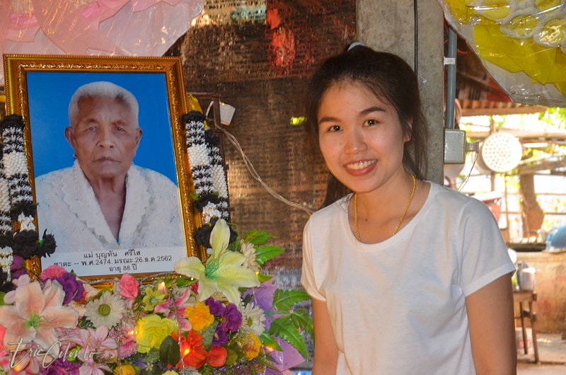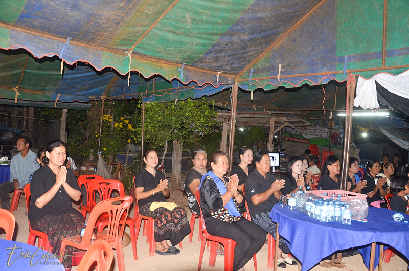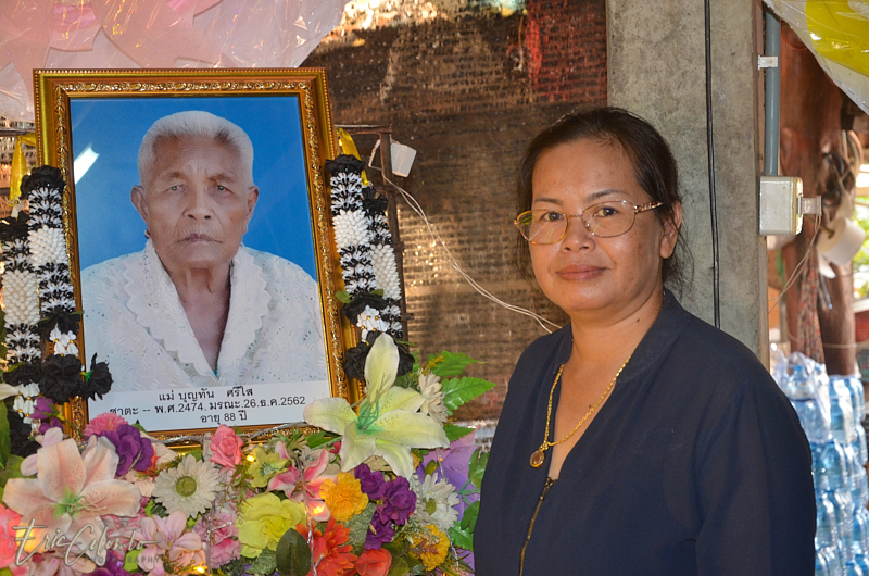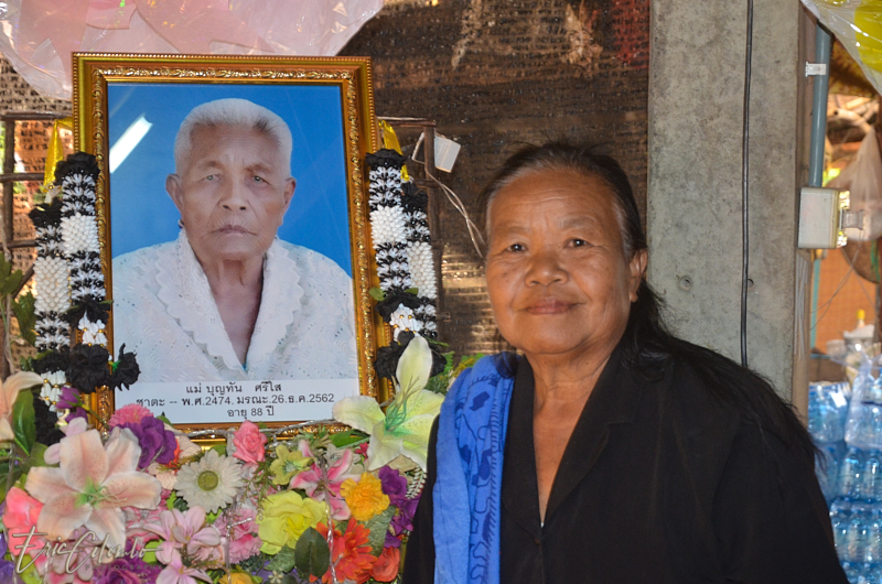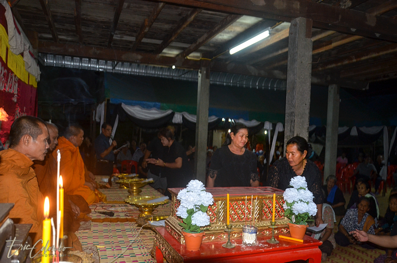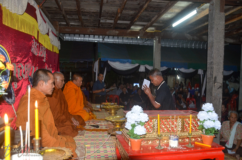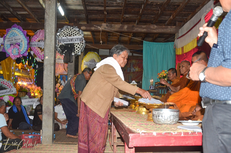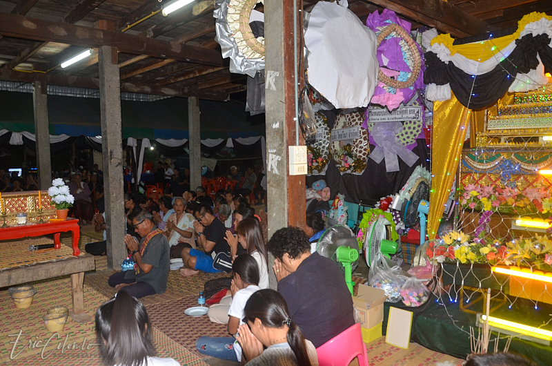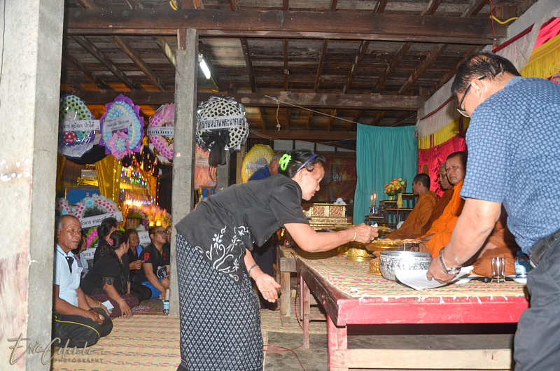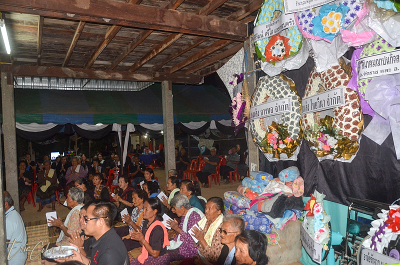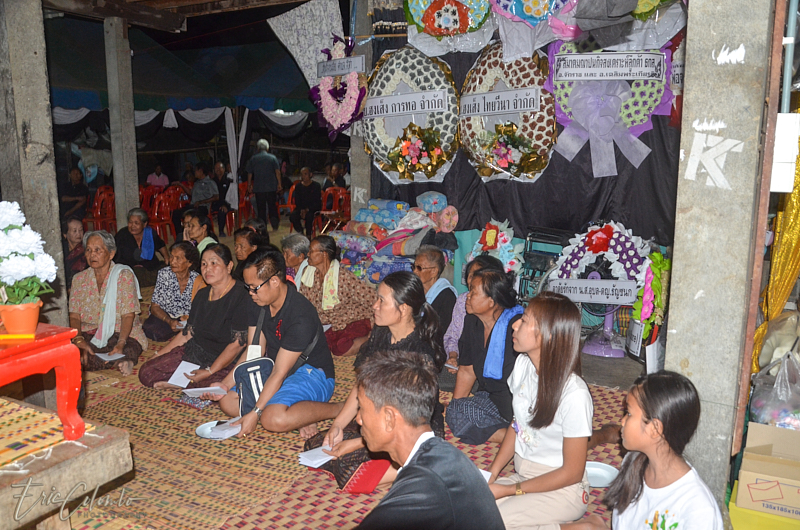 Le 2ème jour, toute la fraterie est complète. Tout au long de la journée il y a du monde pour la préparation des repas. Une des cantines a été dévolue pour la cuisine et beaucoup de villageoise viennent prêter main-forte à cette activité afin de laisser libre les proches pour recevoir les hommages des visiteurs. Il y a constamment une ou deux filles ou fils de la défunte près du cercueil pour recevoir le cadeaux et l'annoncer à leur mère du genre: "Tu vois la cousine de Bangkok à donné une enveloppe" ou "celle-ci à apporter un kilo de riz" tout en tapotant contre le frigo contenant le cercueil.