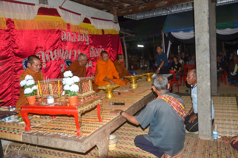 Les 4 moines ont chacun devant eux une large coupe destinée à recevoir les enveloppes et une 5ème pour la famille. Les donateurs se sont auparavant annoncés au maître de cérémonie qui a ainsi fait une liste et pourra les appeler le moment venu. En effet, il y a des périodes de prière, entre-coupées de celle des offrandes.