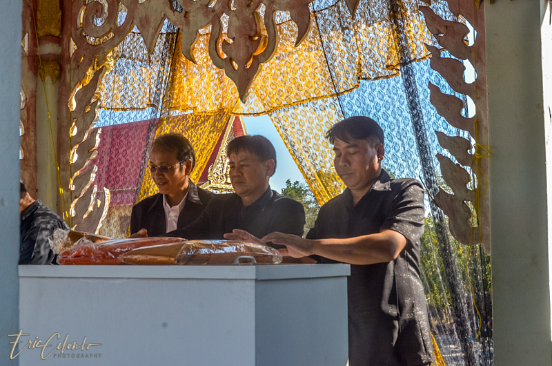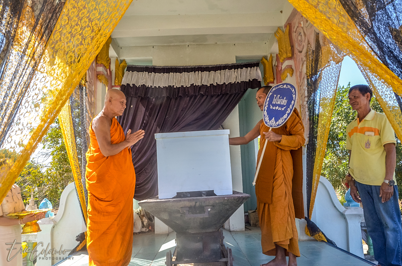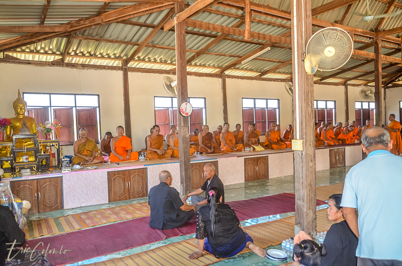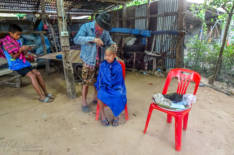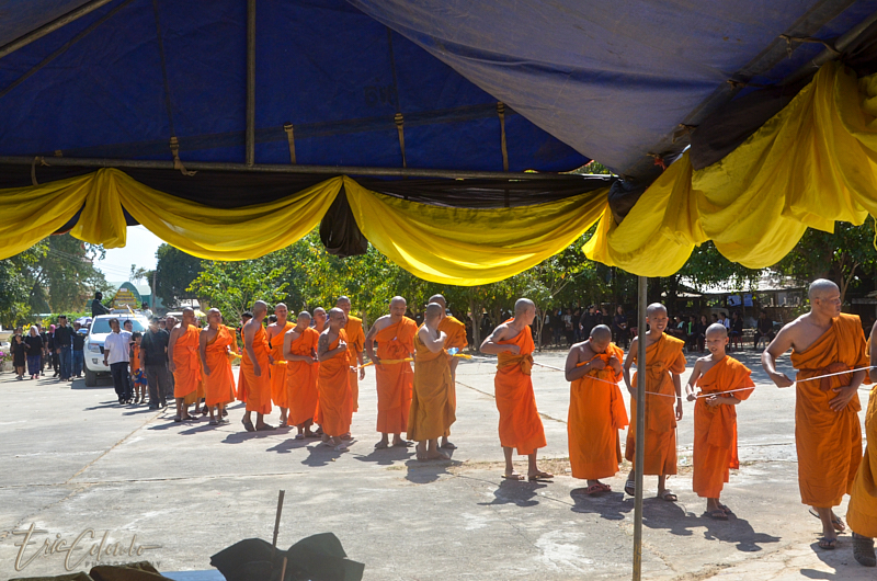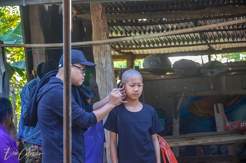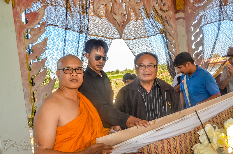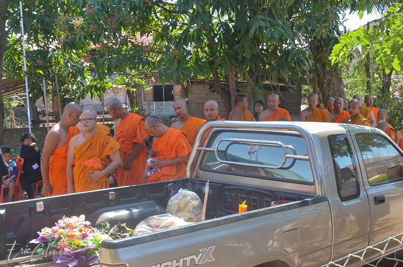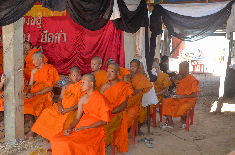 Au matin du 4ème jour une vingtaine d'hommes de la famille, dont 2 frères à Nit, vont se raser complètement la tête, y compris les sourcils. Après une dernière prière devant le sarcophage (photo #9), ils sont habillés en moines et se joindront à la dizaine de vrai pour une dernière cérémonie à la maison. La trdition veut que plus il y a de moines pour prier mieux sera l'esprit pour quitter son corps.