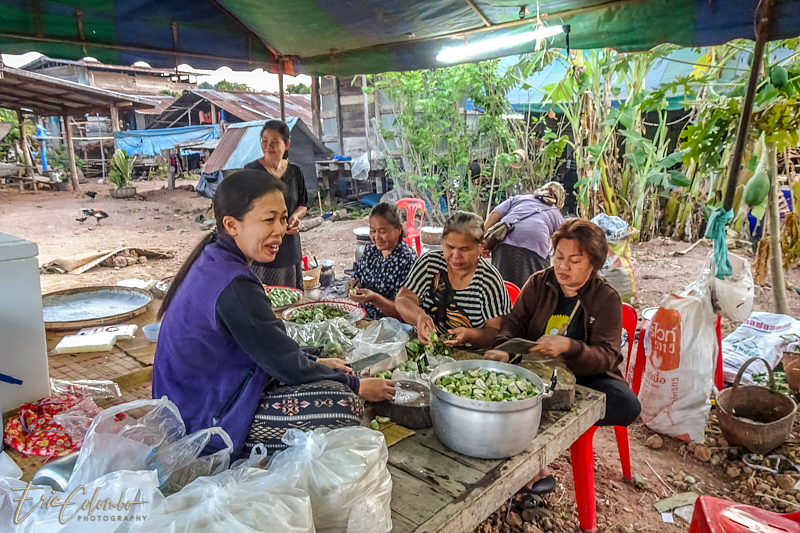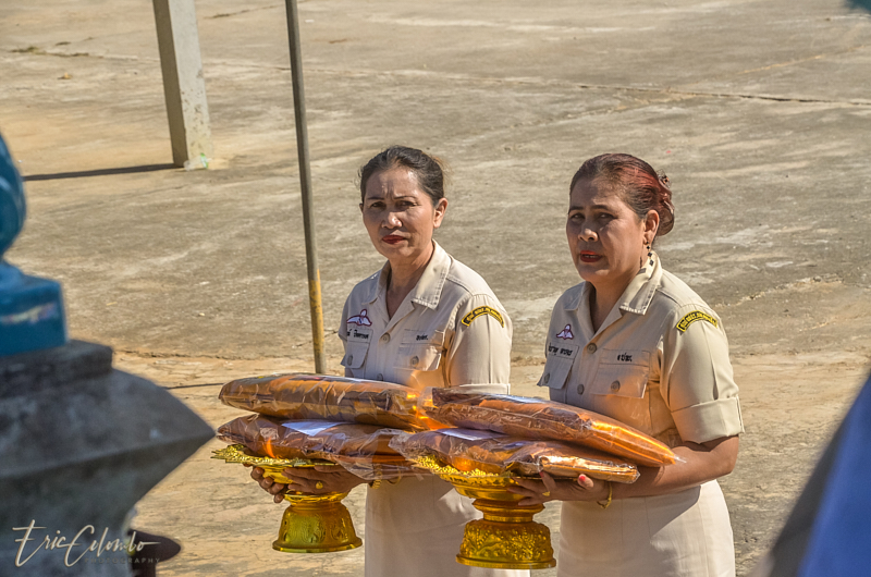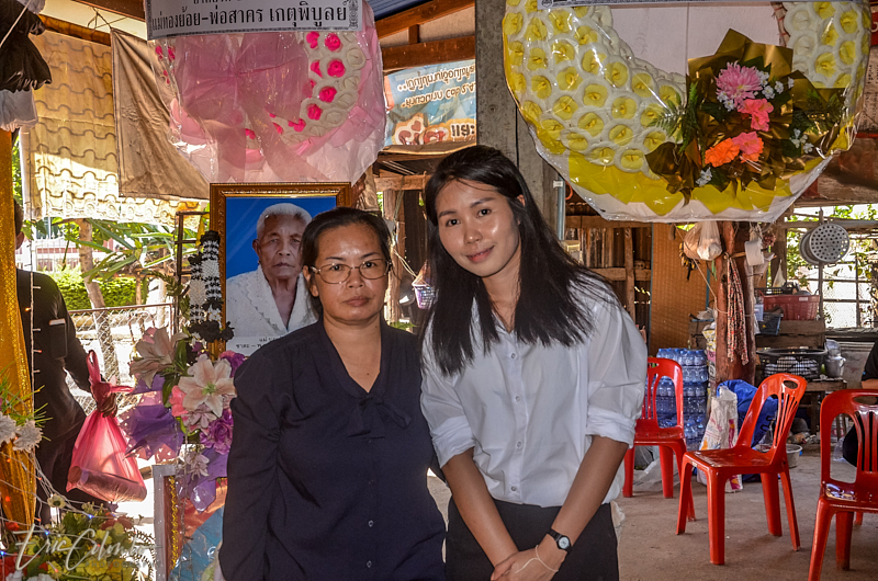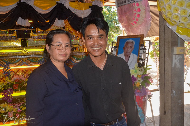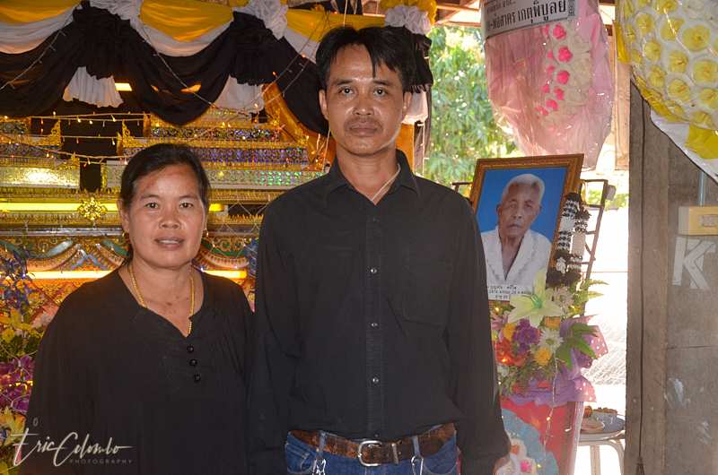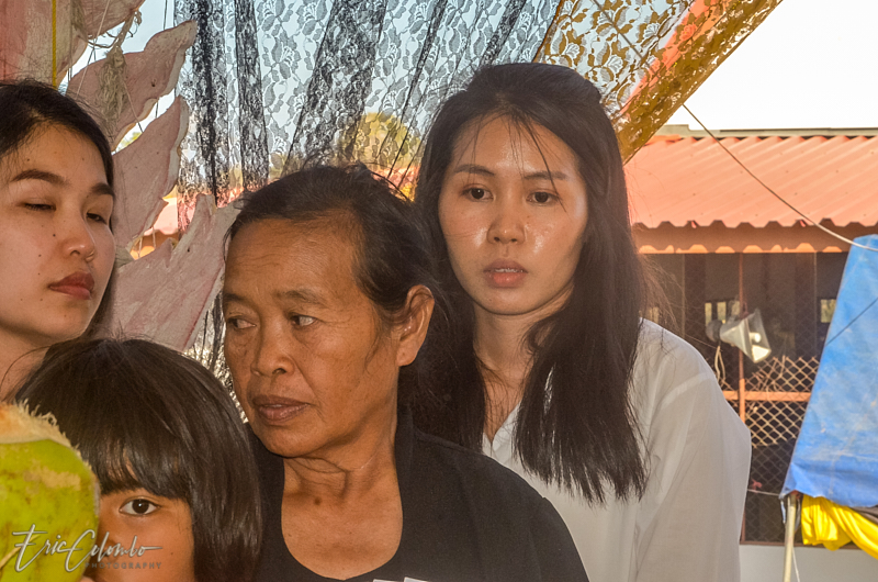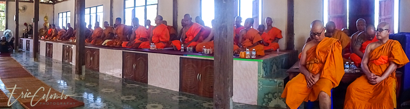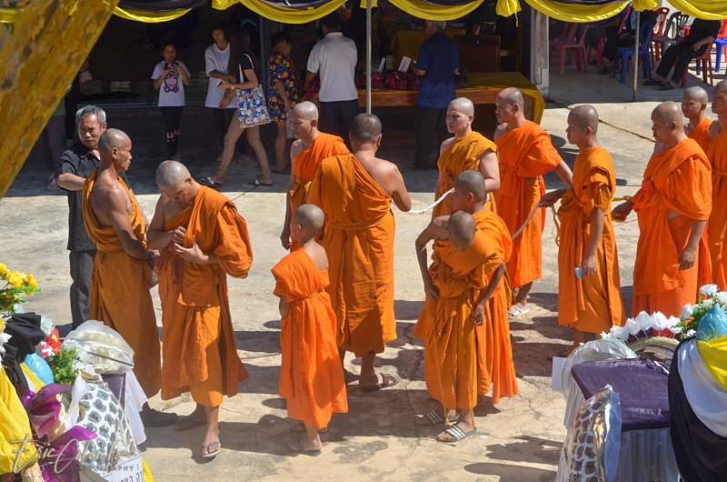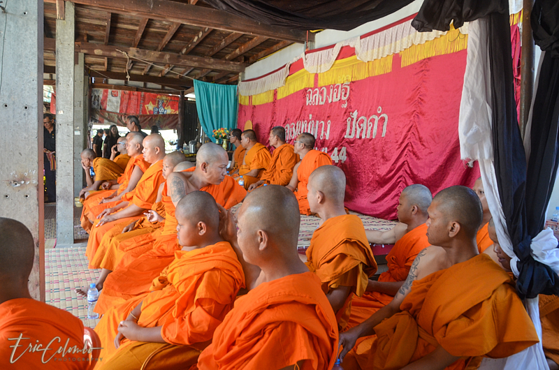 Au matin du 4ème jour une vingtaine d'hommes de la famille, dont 2 frères à Nit, vont se raser complètement la tête, y compris les sourcils. Après une dernière prière devant le sarcophage (photo #9), ils sont habillés en moines et se joindront à la dizaine de vrai pour une dernière cérémonie à la maison. La trdition veut que plus il y a de moines pour prier mieux sera l'esprit pour quitter son corps.