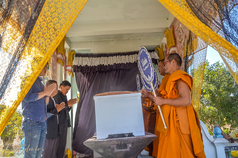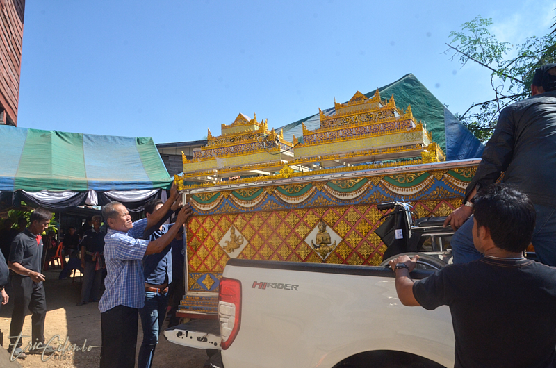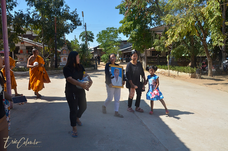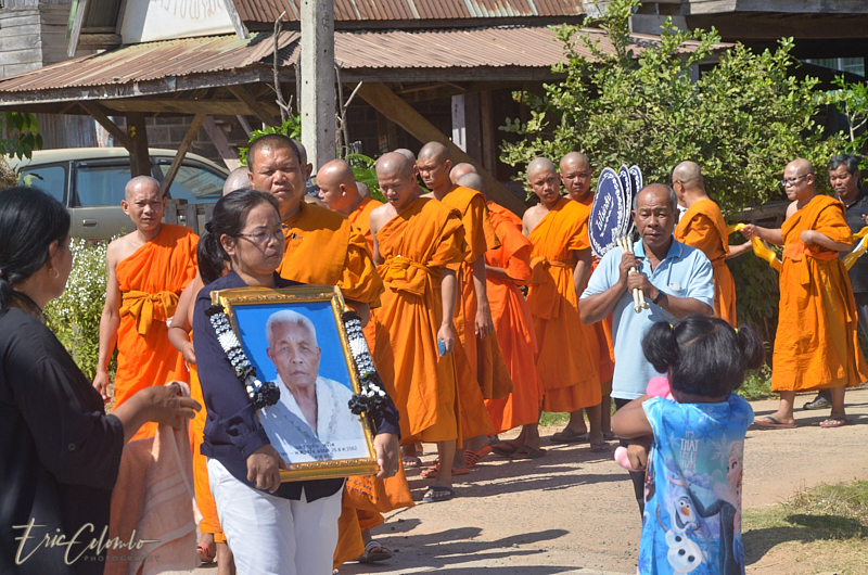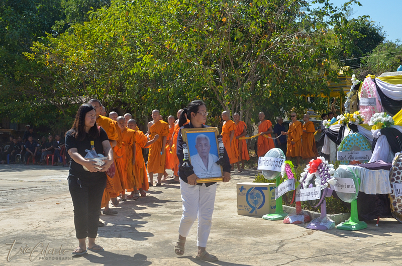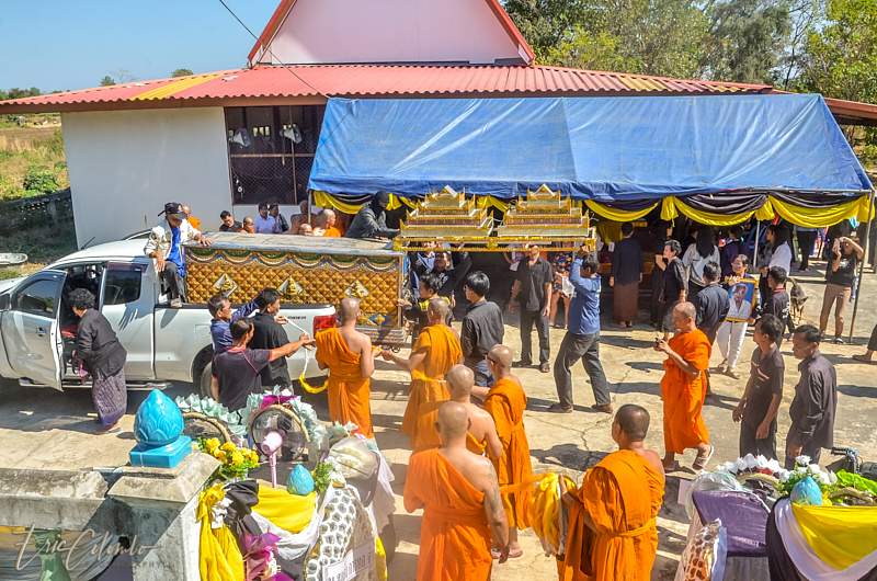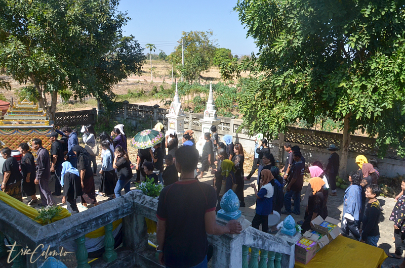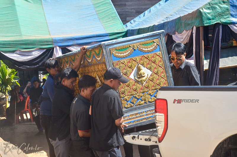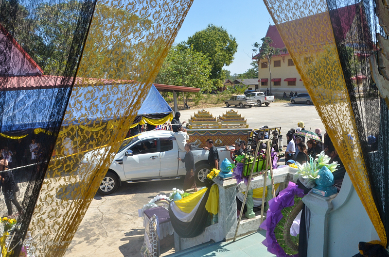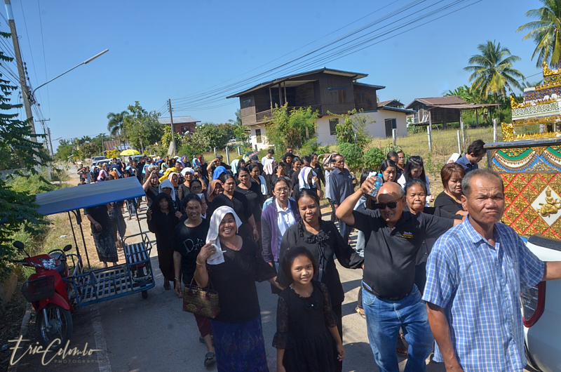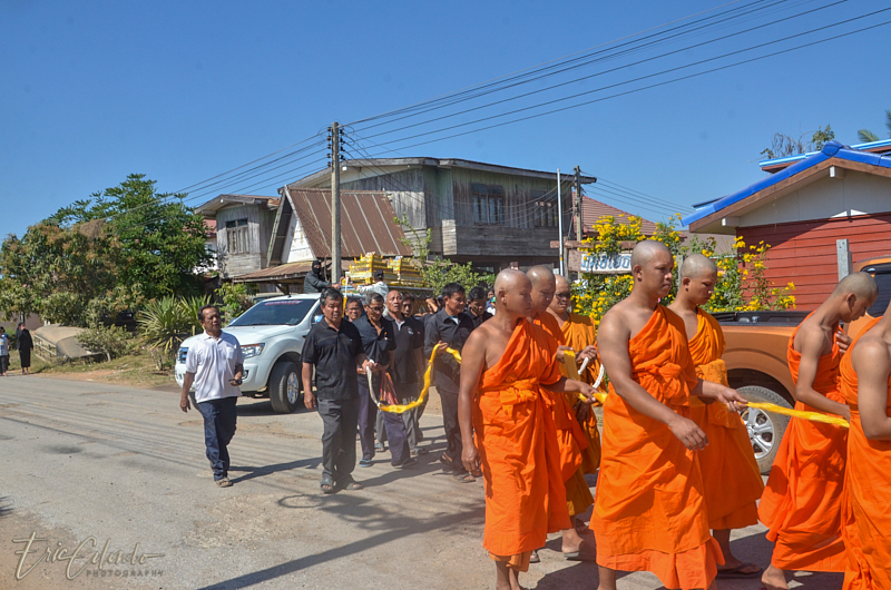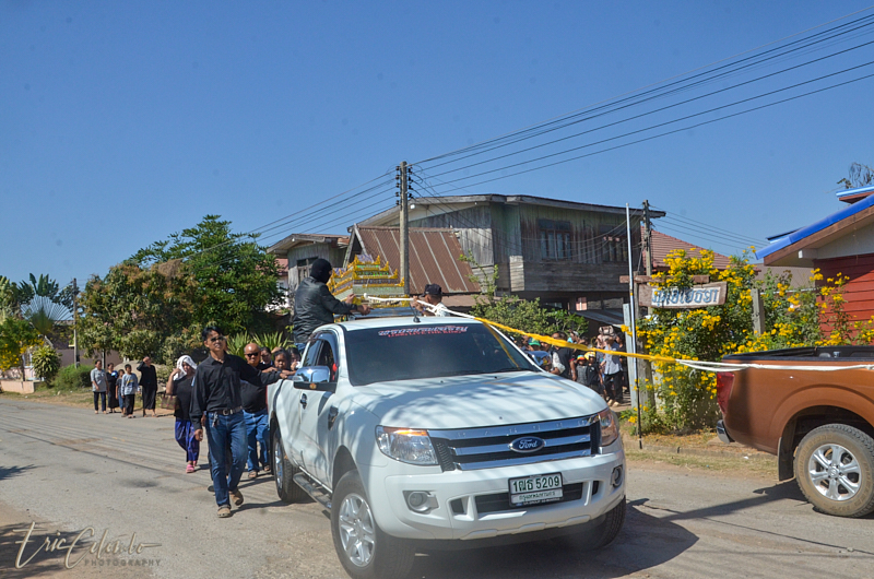 Une fois le cercueil chargé sur un pick-up, le cortège funéraire se dirige vers le temple. Une longue corde de soie est attachée au cercueil et les membres de la famille ainsi que les moines (vrais ou faux) marchent devant le véhicule en tenant cette corde. Nit avec le portrait de la défunte ouvre la marche. Derrière le cercueil les nombreux amis accompagnent la dépouille jusqu'au temple.