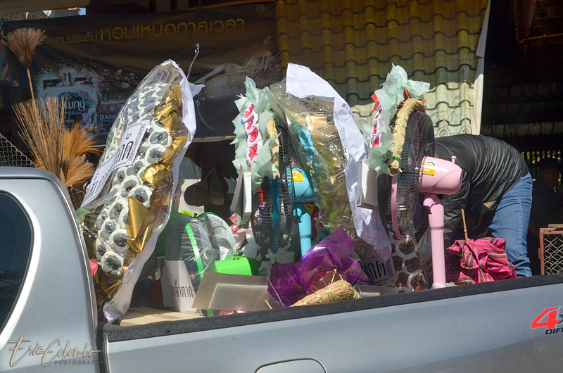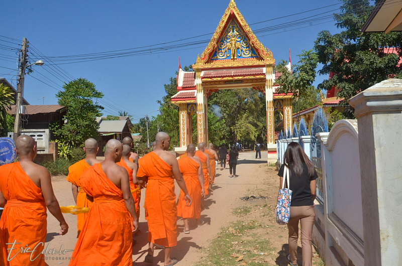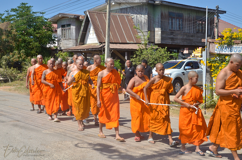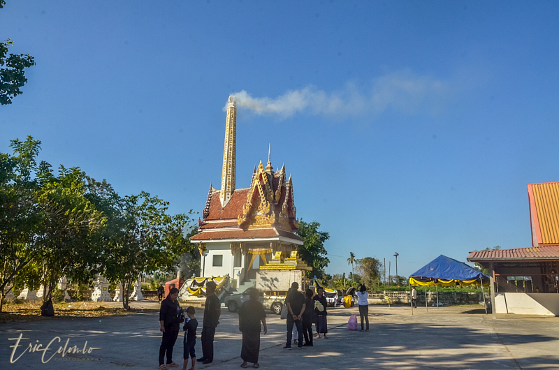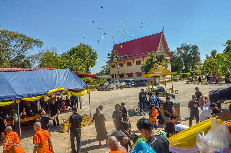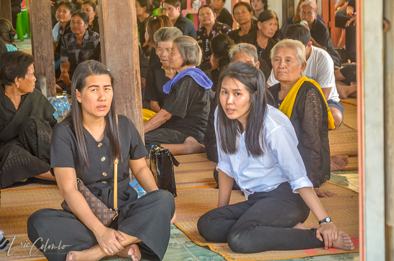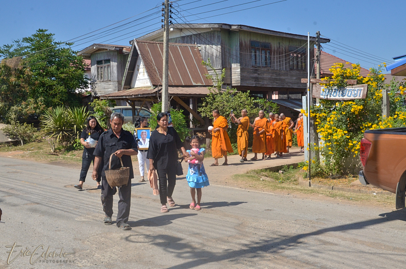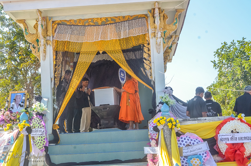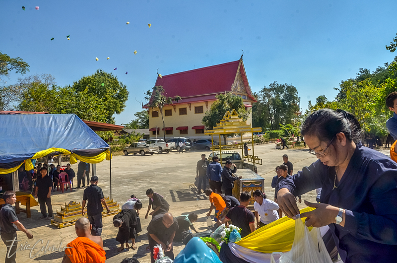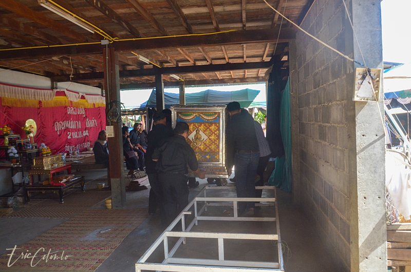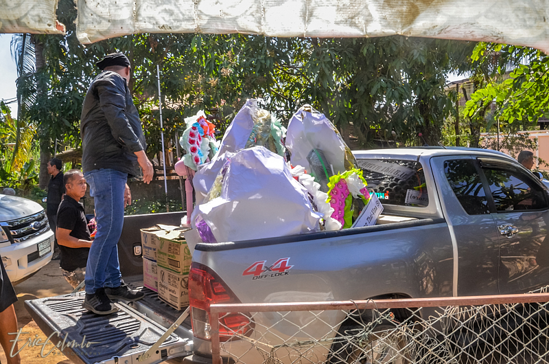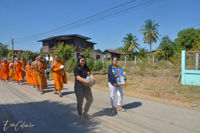 Une fois le cercueil chargé sur un pick-up, le cortège funéraire se dirige vers le temple. Une longue corde de soie est attachée au cercueil et les membres de la famille ainsi que les moines (vrais ou faux) marchent devant le véhicule en tenant cette corde. Nit avec le portrait de la défunte ouvre la marche. Derrière le cercueil les nombreux amis accompagnent la dépouille jusqu'au temple.