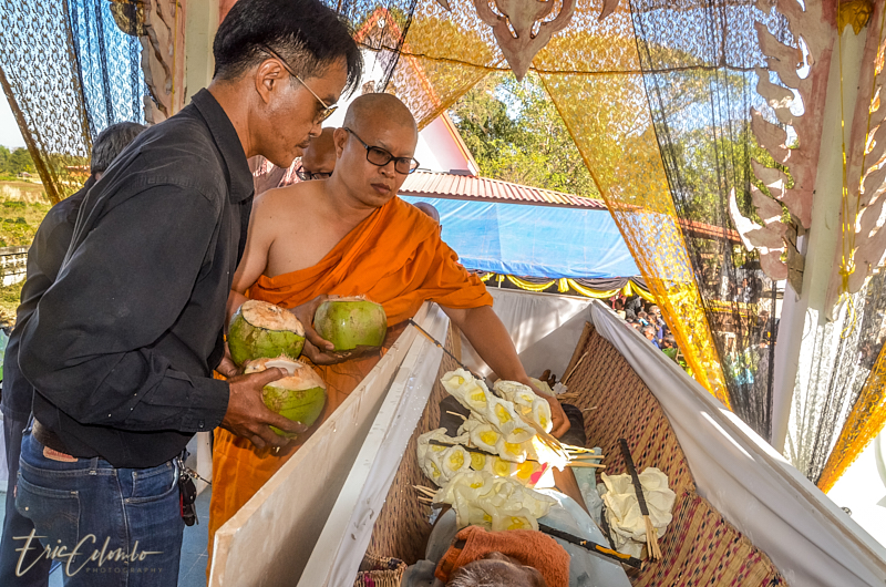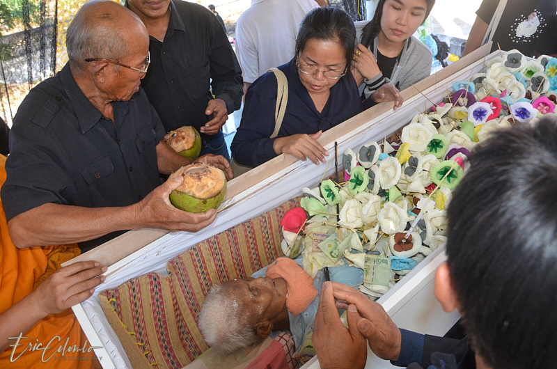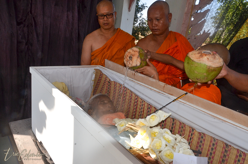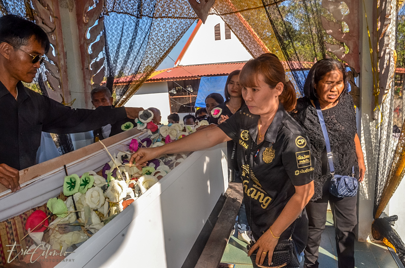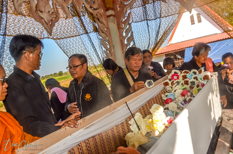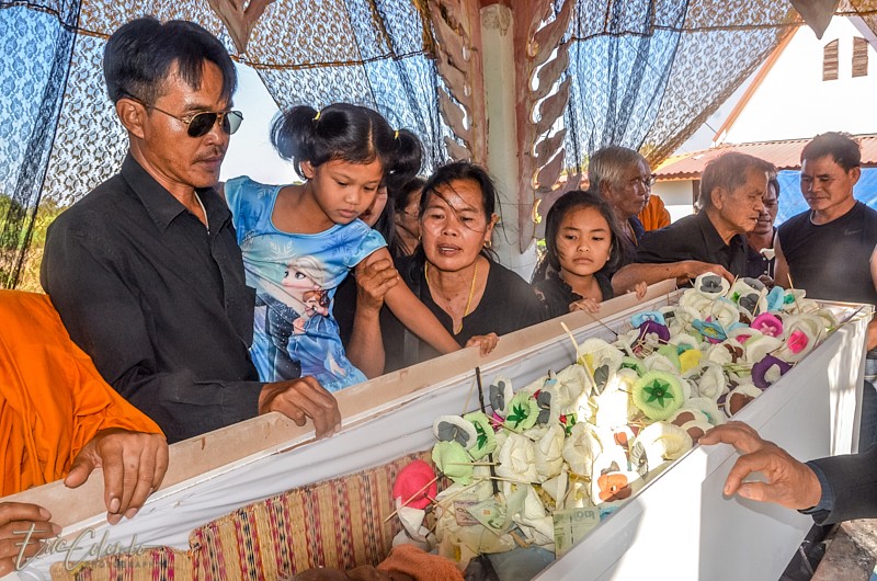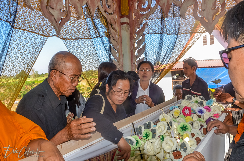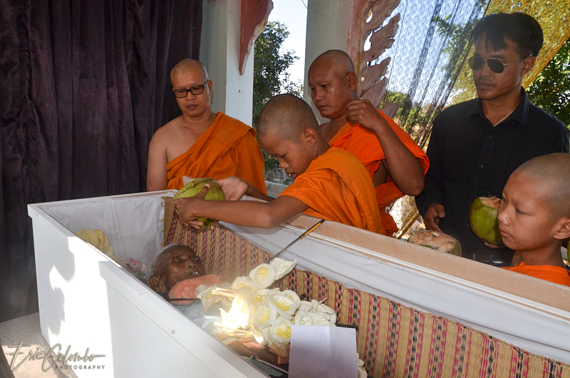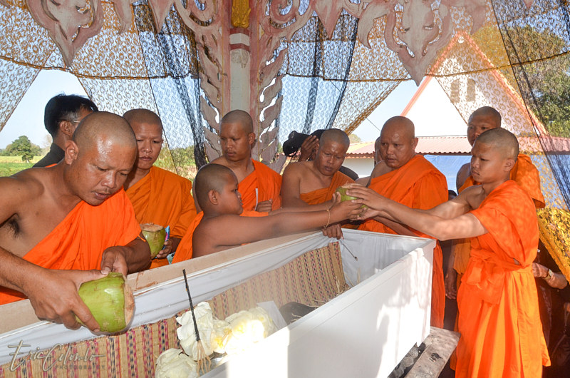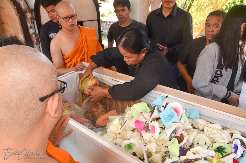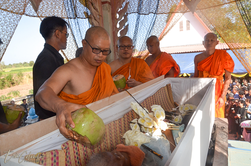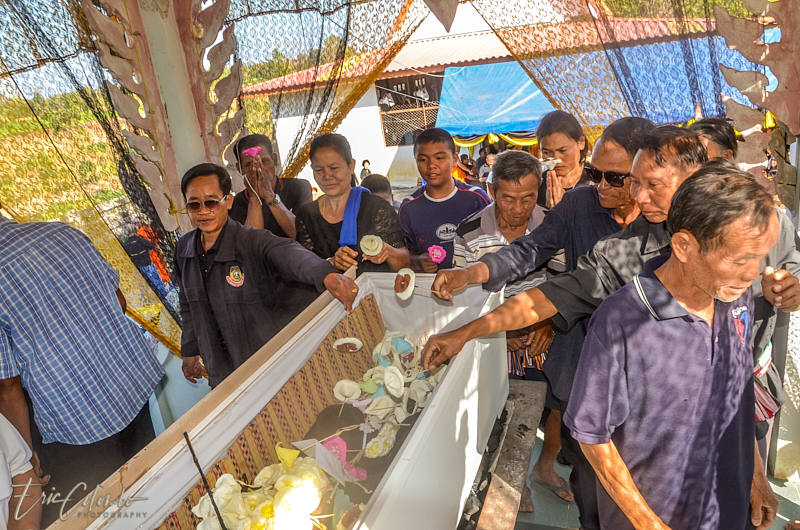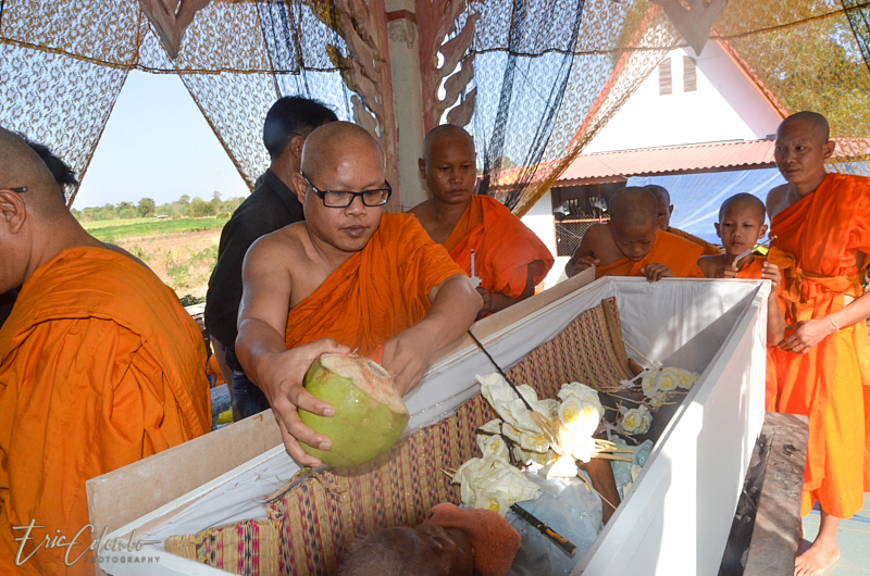 Après cela tout le monde va dire un dernier adieu à la défunte. Les moines viennent en premier avec des noix de coco ouvertes et arrosent le visage du cadavre. Puis les parents et amis viennent avec une fleur en papier qu'il jette dans le cercueil après avoir tapé 3 fois contre les parois de celui-ci.