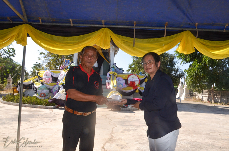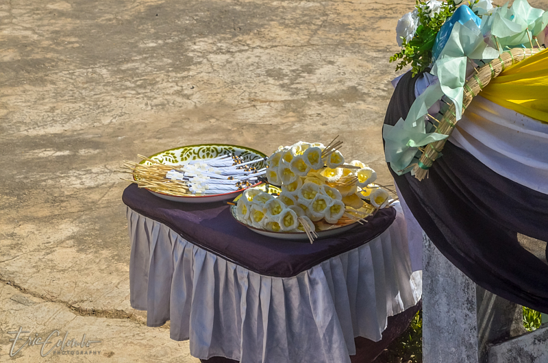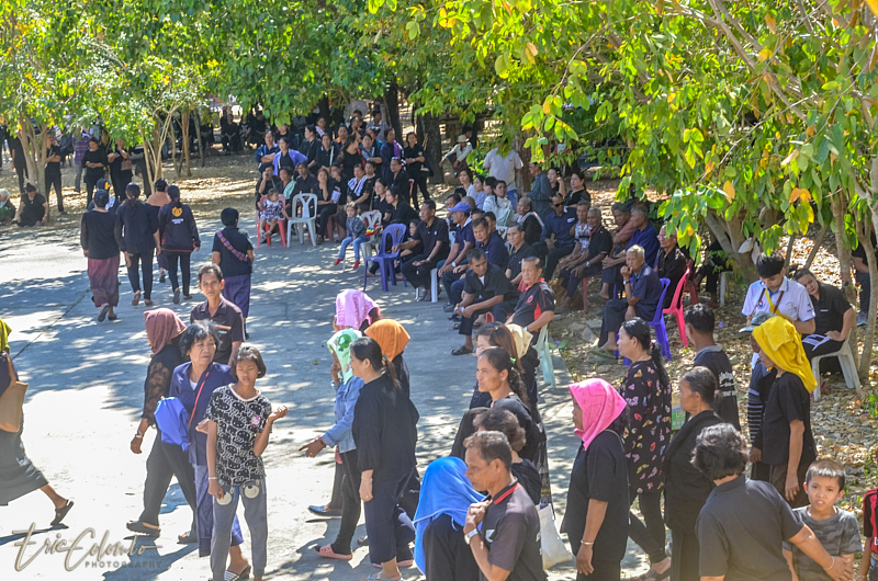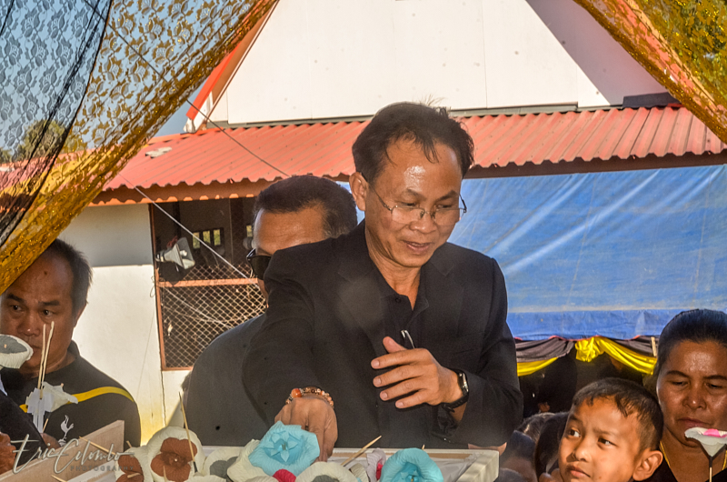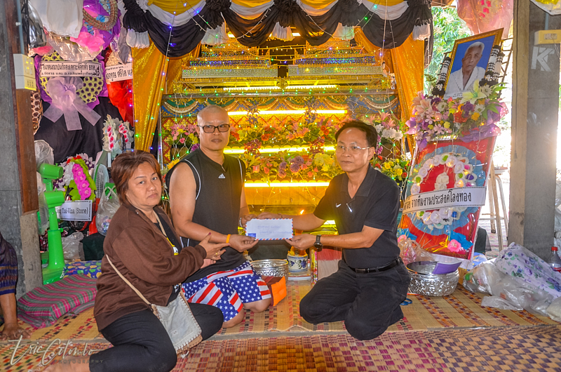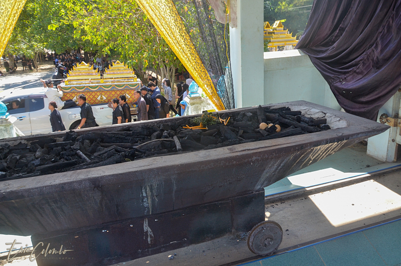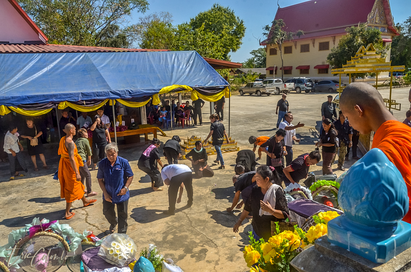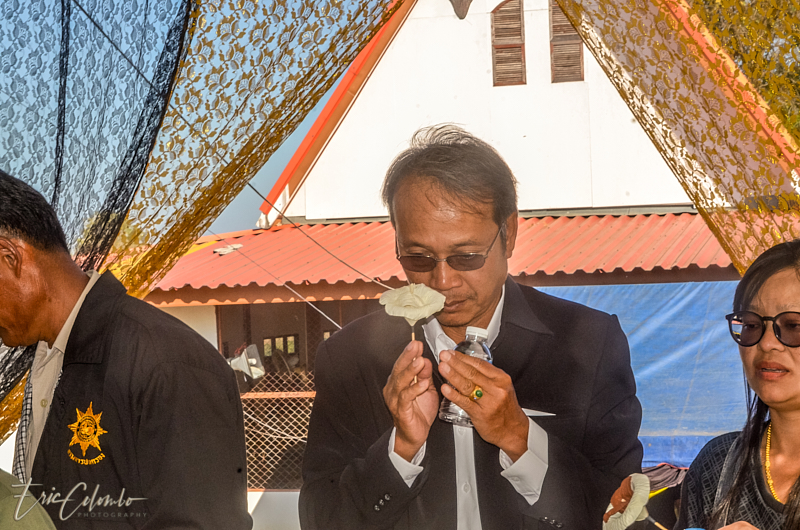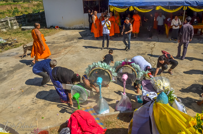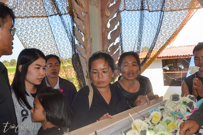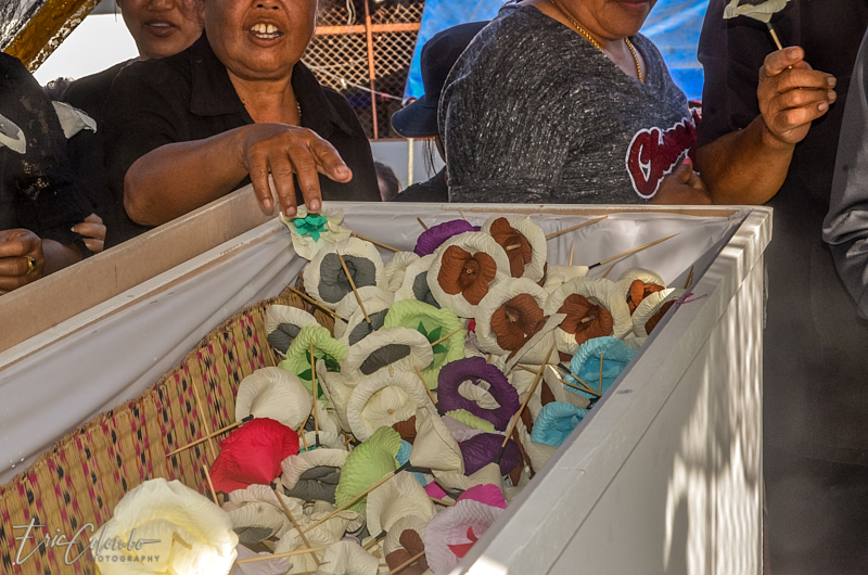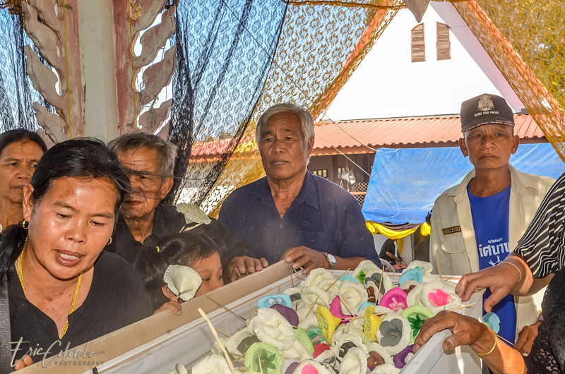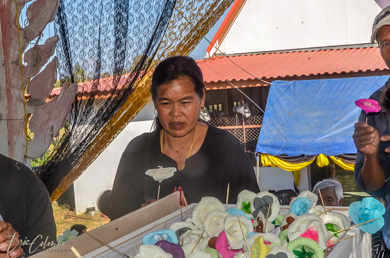 Après cela tout le monde va dire un dernier adieu à la défunte. Les moines viennent en premier avec des noix de coco ouvertes et arrosent le visage du cadavre. Puis les parents et amis viennent avec une fleur en papier qu'il jette dans le cercueil après avoir tapé 3 fois contre les parois de celui-ci.