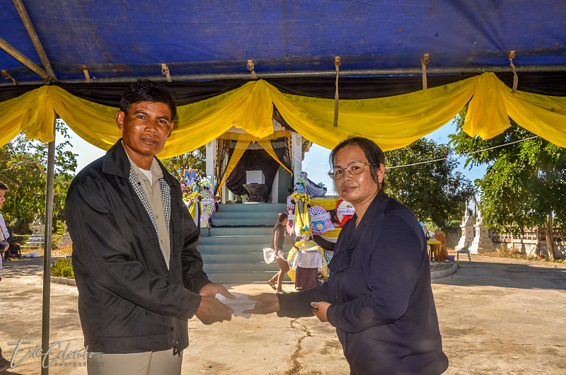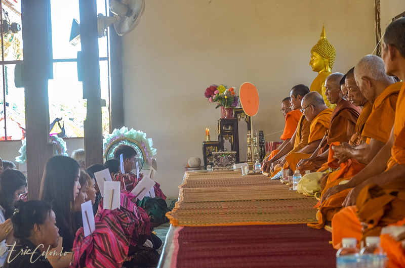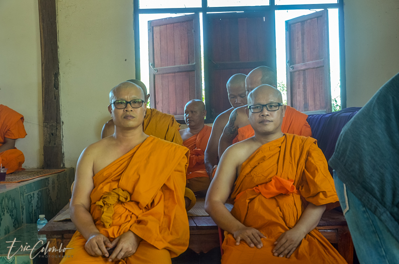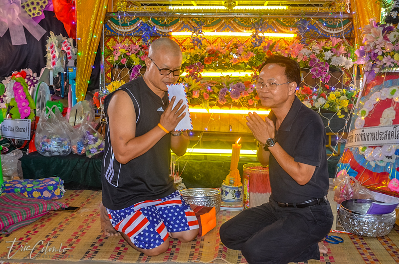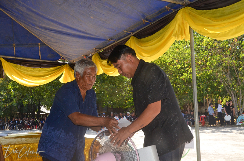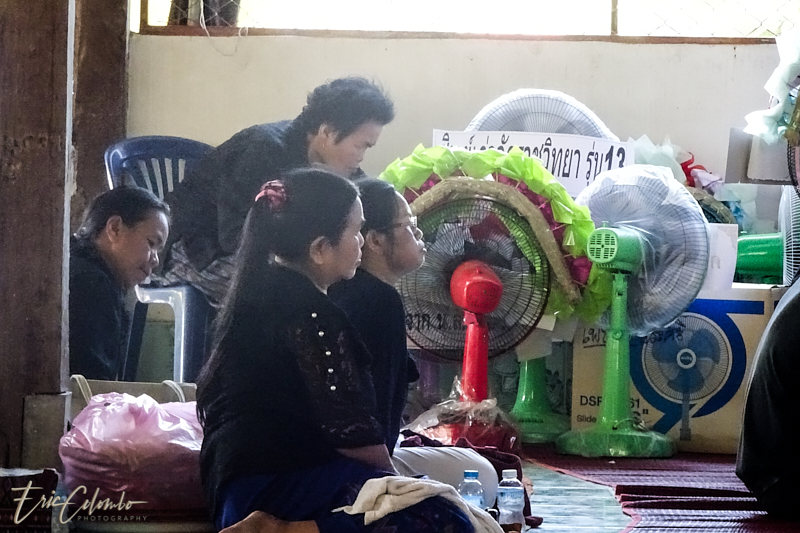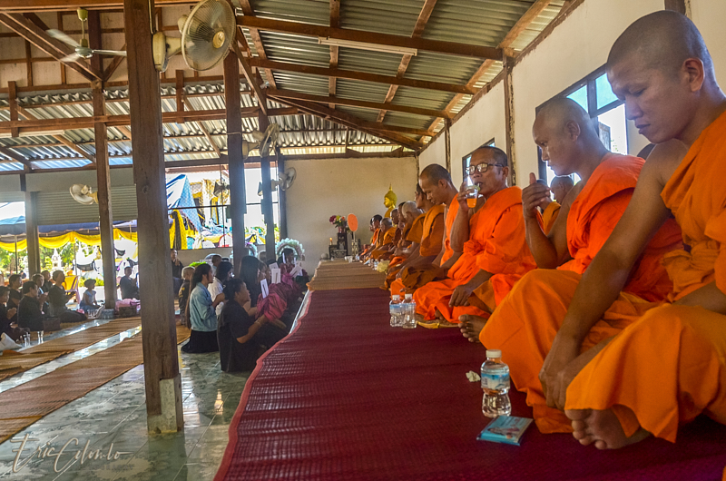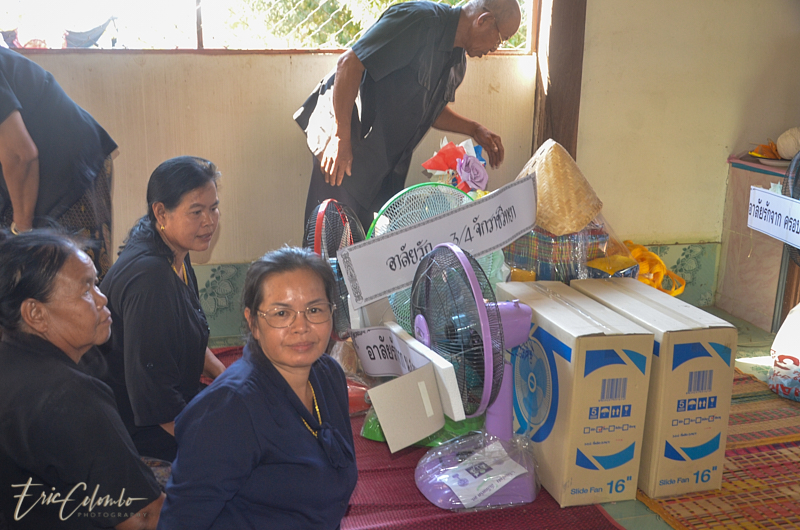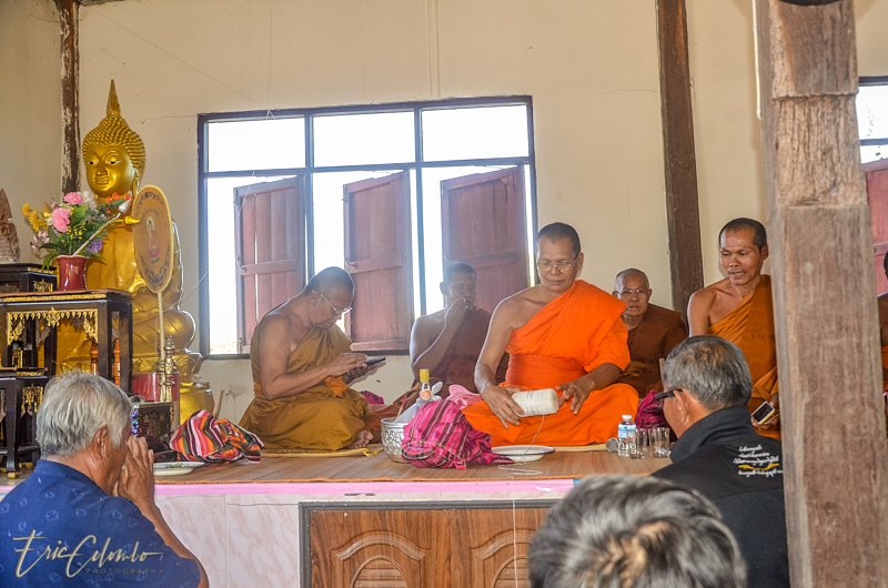 Tout le monde s'installe dans la grande salle de prière et c'est reparti pour les litanies entrecoupées de séances cadeaux. Toutefois les enveloppes sont données qu'aux vrais moines. La famille reçoit encore des cadeaux, spécialement des ventilateurs, qu'elle va partager avec les moines.