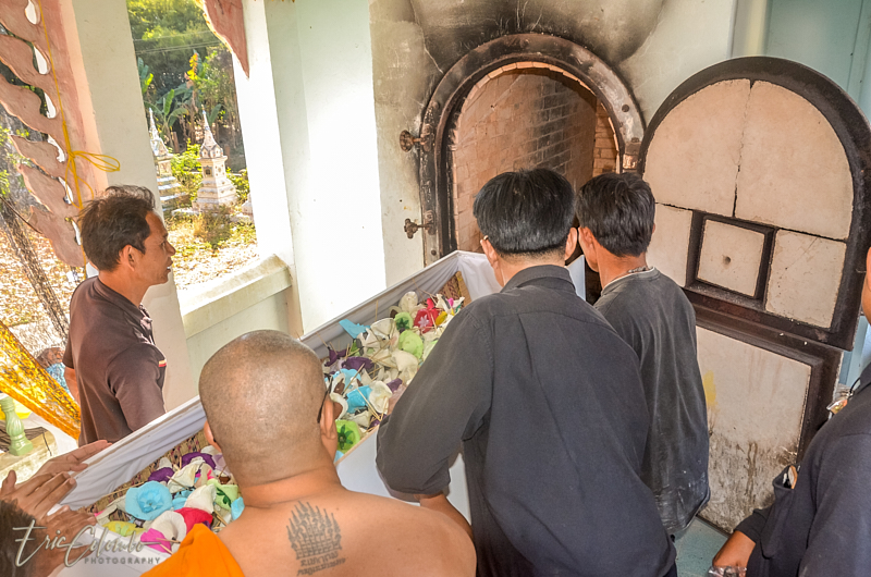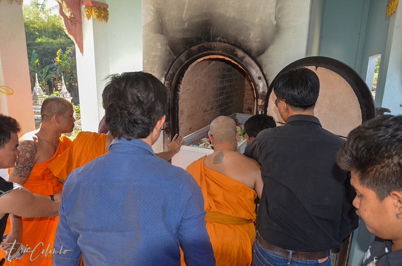 Quand tout le monde à passé, l'employé du crématoire arrose d'essence le tour du cercueil et en verse également à l'intérieur. Le chariot est poussé dans le four et un fils électrique dénudé est déposé sur le corps pour déclencher le feu; il y a 9 ans c'était avec une allumette que le brasier était allumé.