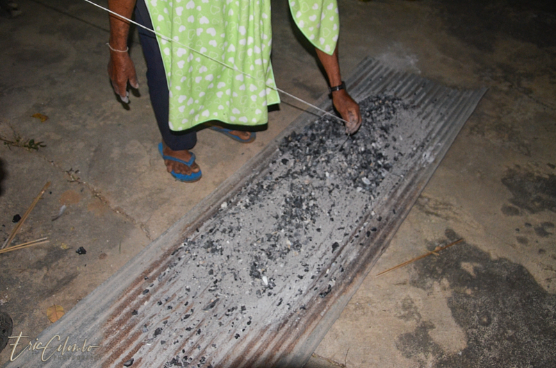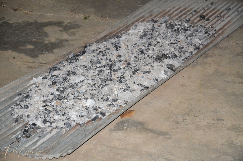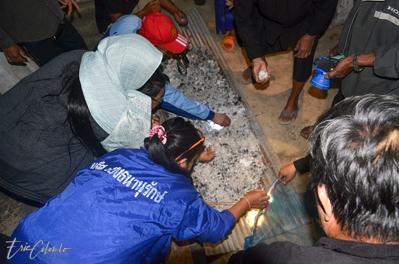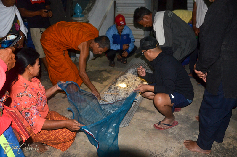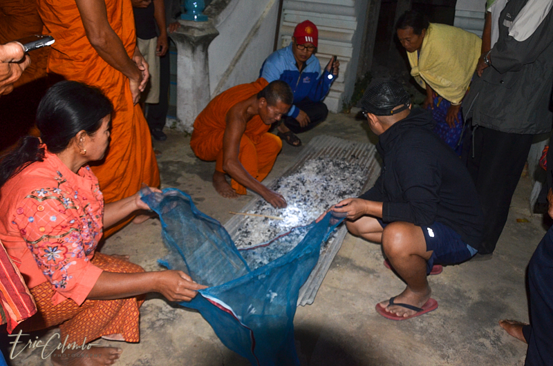 Le lendemain de la crémation, à 5 heures du matin, la famille se rend au crématoire. Les cendres sont posés sur un bout de tôle ondulée. Les moines ont la primeur pour trier et récupérer les os humains. Puis la famille se met également à cette tâche. Les ossements sont mis dans un sac en filet qui sera arrosé d'eau pour les laver.