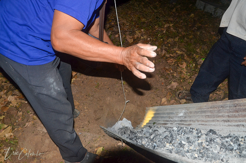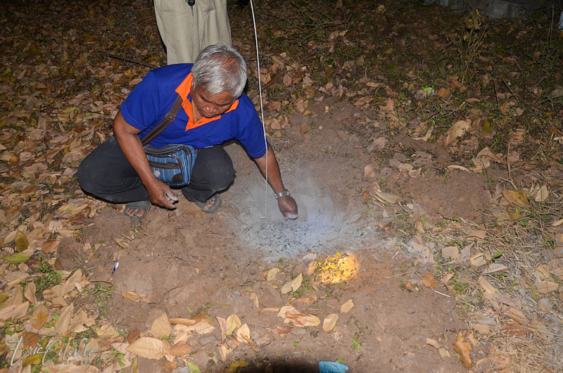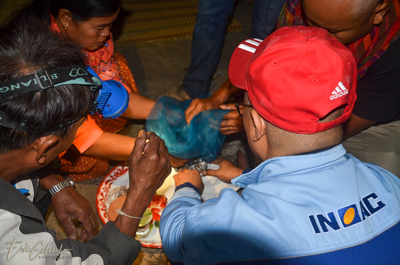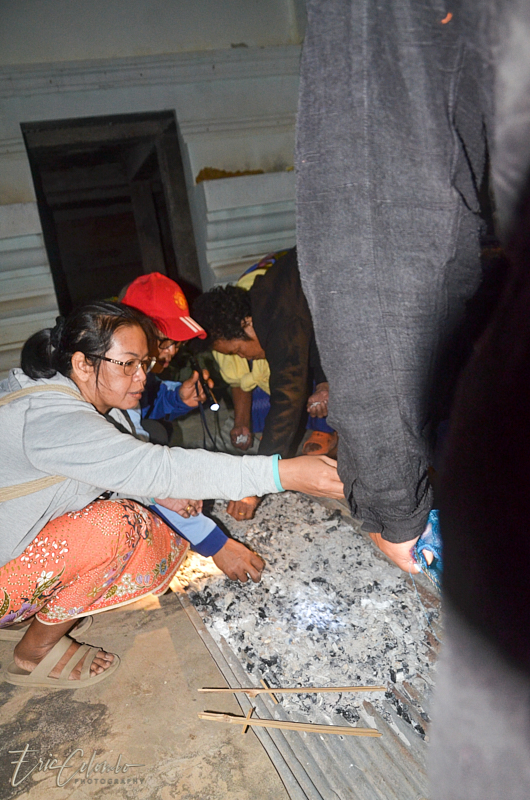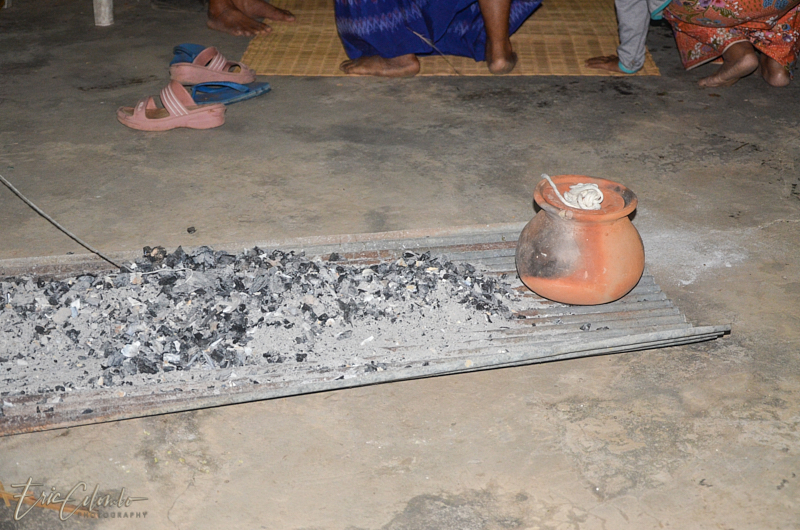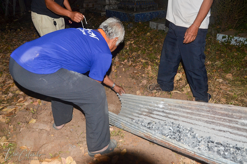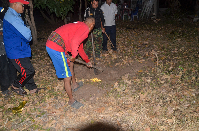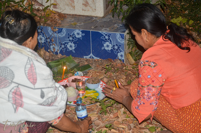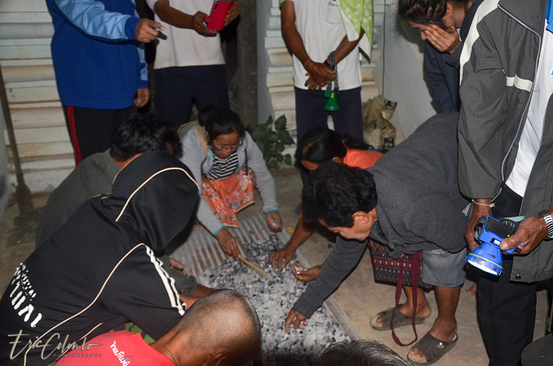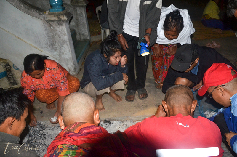 Les moines entament un rituel de prières repris en choeur par la famille. Quand ils ont terminé le surplus des cendres est versé dans un trou creusé précédemment et c'est le retour à la maison.