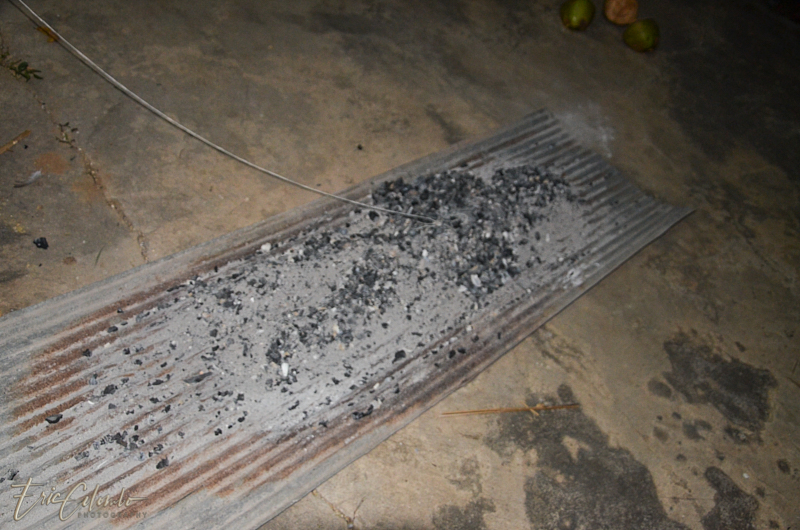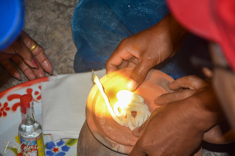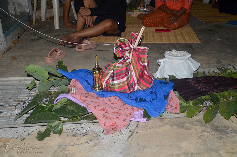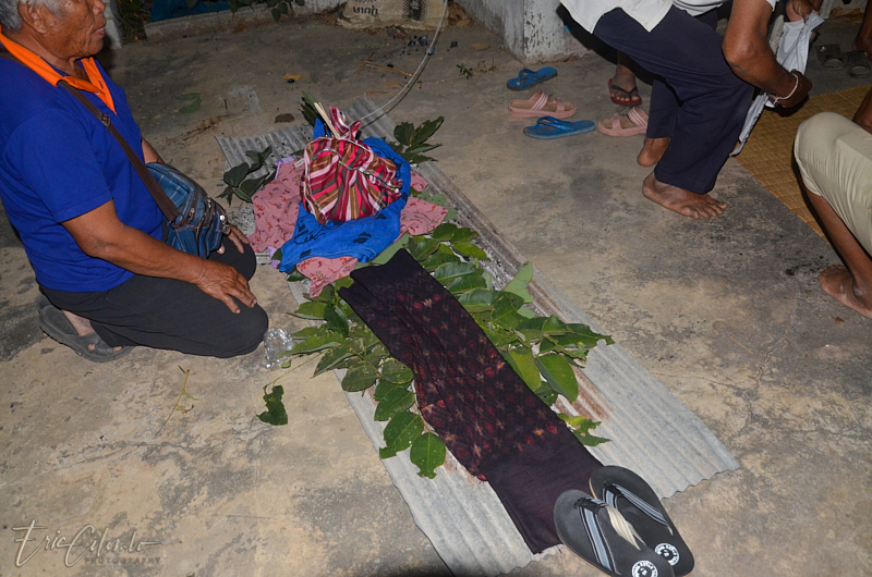 Afin d'illustrer le départ puis la réincarnation de la morte, un des fils fait une forme humaine avec le reste des cendres sur laquelle sont déposé des habits, un balluchon et l'urne contenant une prtie des cendres.