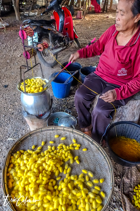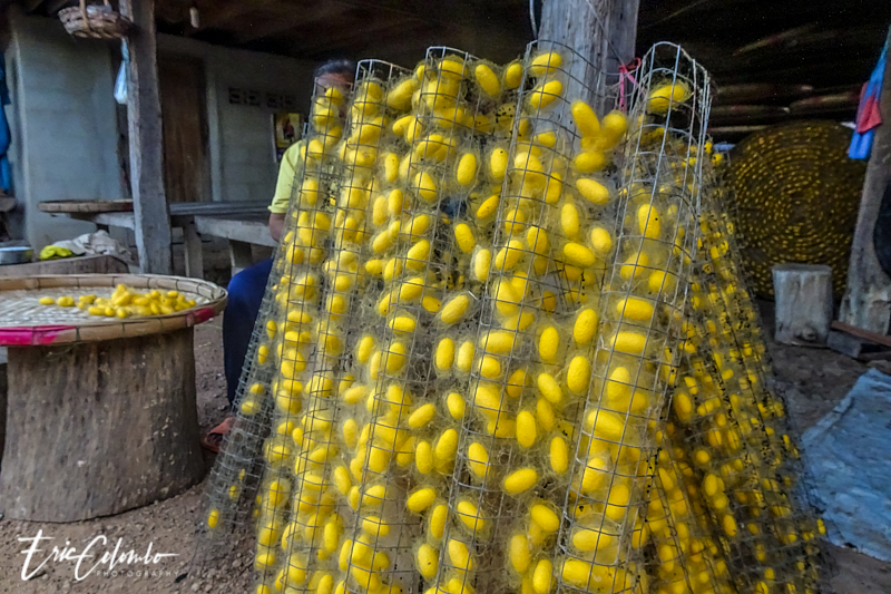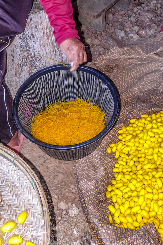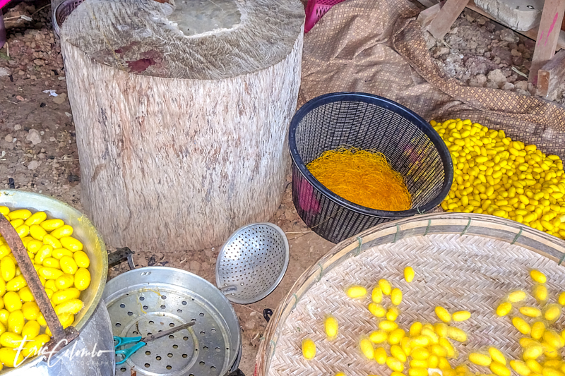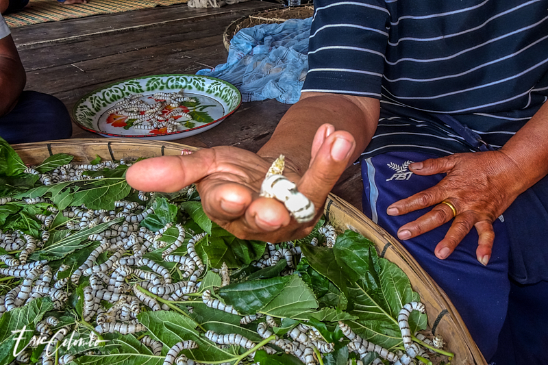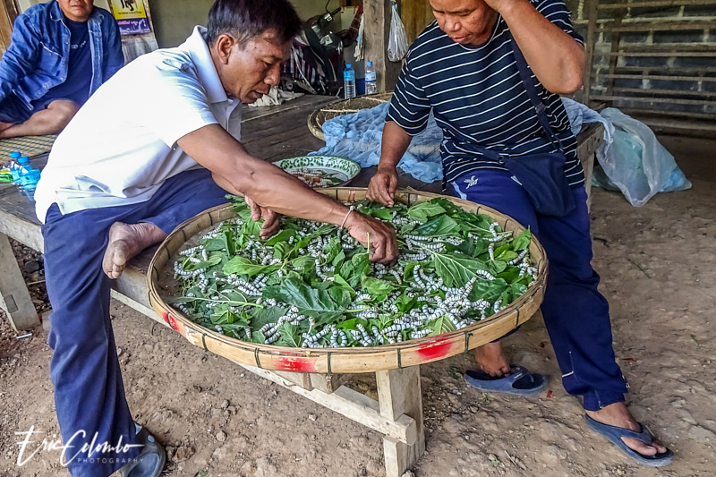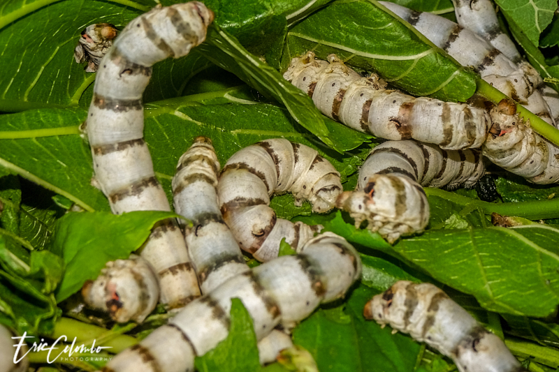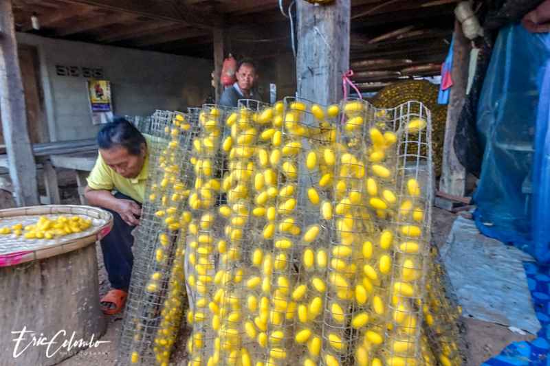 En marge de cette cérémonie funéraire, j'ai eu la possibilité de voir comment se fabriquait la soie. Une de mes belle-sœurs m'a montré son élevage de vers à soie. Les vers de 2 mm à l'éclosion sont placé sur des plateau couvert de feuilles de mûrier. Les feuilles du mûrier blanc sont l'alimentation préférée du ver à soie, donnant la soie de meilleure qualité. Le Bombyx mori est inconnu à l'état sauvage. C'est un produit tout à fait artificiel de sélection par élevage appelé sériciculture, avec une grande variété de lignées et de races qui diffèrent par la couleur et la qualité de la soie, la dimension et la forme du cocon, le nombre de générations annuelles. Après 4 mues successives le ver a une grandeur de 40 à 80 mm (photos 1-6).