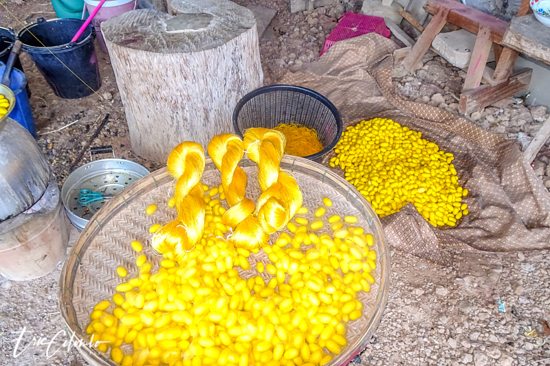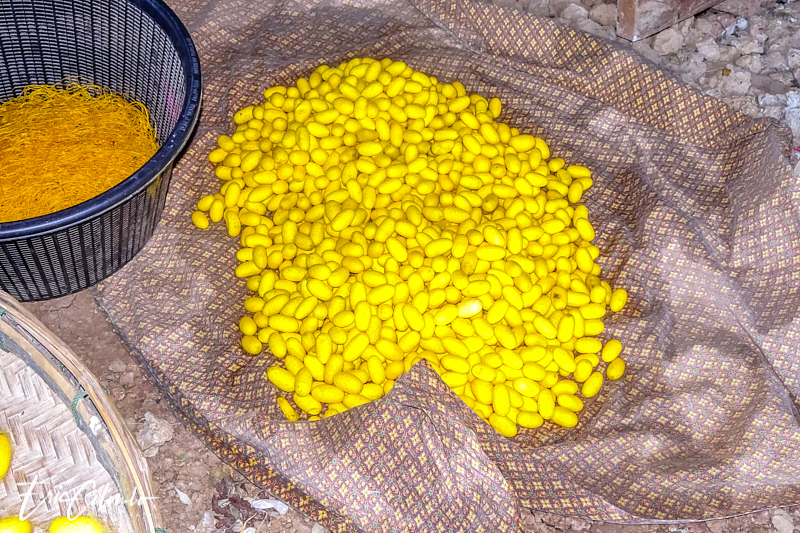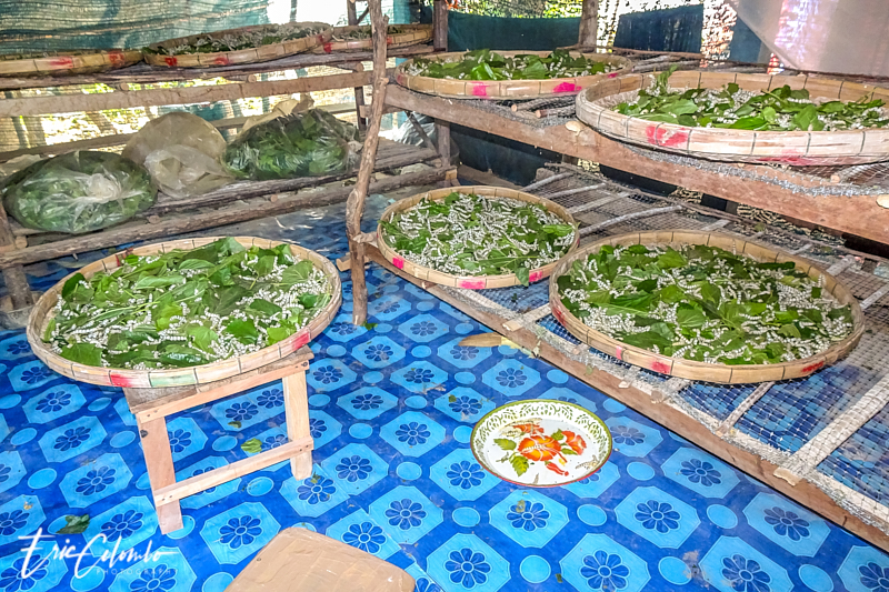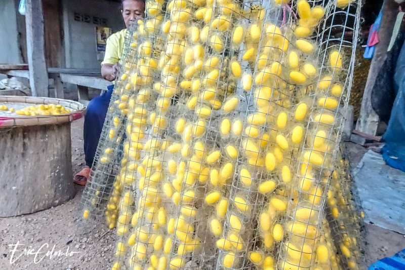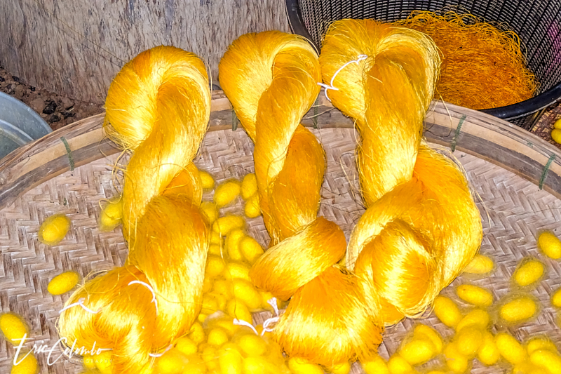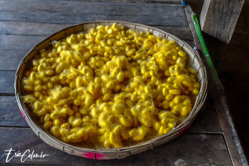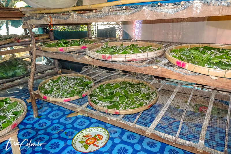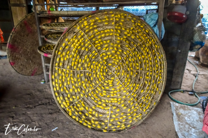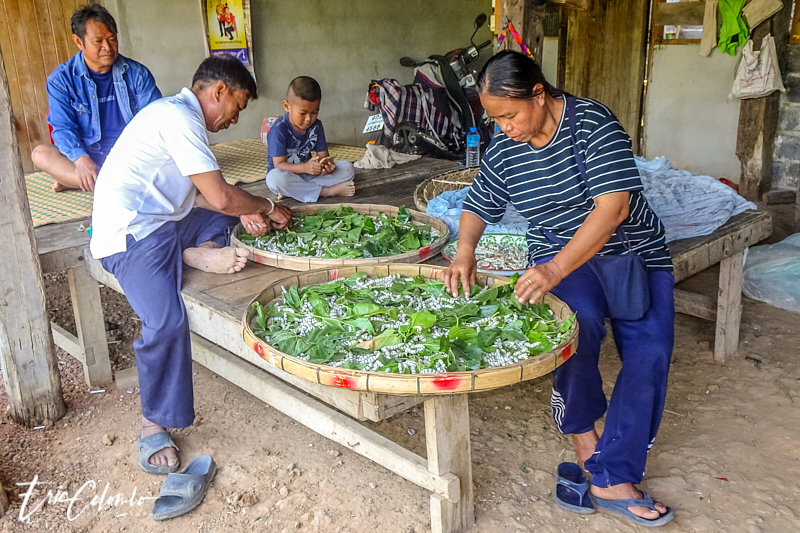 En marge de cette cérémonie funéraire, j'ai eu la possibilité de voir comment se fabriquait la soie. Une de mes belle-sœurs m'a montré son élevage de vers à soie. Les vers de 2 mm à l'éclosion sont placé sur des plateau couvert de feuilles de mûrier. Les feuilles du mûrier blanc sont l'alimentation préférée du ver à soie, donnant la soie de meilleure qualité. Le Bombyx mori est inconnu à l'état sauvage. C'est un produit tout à fait artificiel de sélection par élevage appelé sériciculture, avec une grande variété de lignées et de races qui diffèrent par la couleur et la qualité de la soie, la dimension et la forme du cocon, le nombre de générations annuelles. Après 4 mues successives le ver a une grandeur de 40 à 80 mm (photos 1-6).