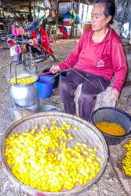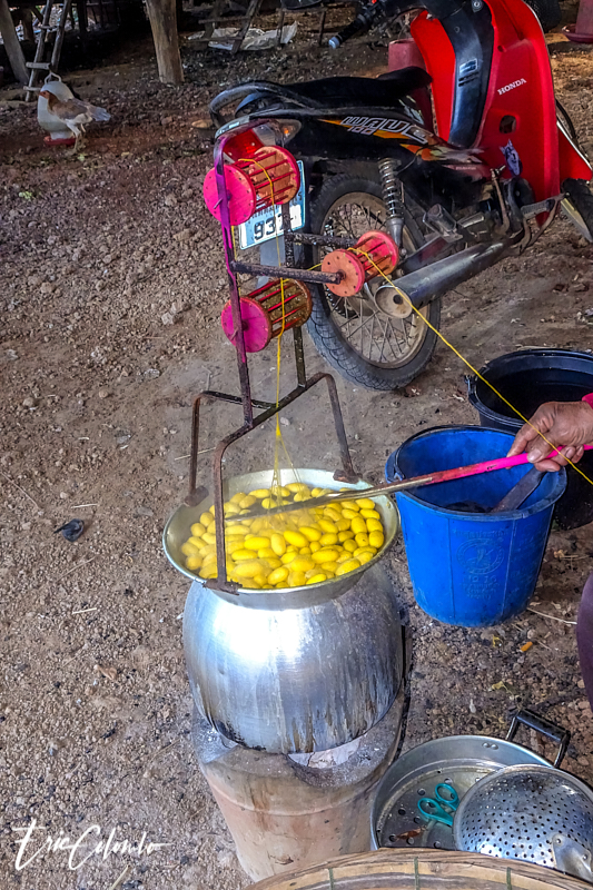 Les cocons sont ensuite étouffés dans des étuves de 70 à 80 °C, puis trempés dans l'eau bouillante pour que le grès (ou séricine, colle naturelle protégeant les brins) se ramollisse. Chaque cocon n'est fait que d'un seul fil appelé bave. Pour trouver l'extrémité de chaque fil, on remue constamment les cocons avec un petit balai de paille de riz. Celui-ci sert à accrocher les premiers fils de dévidage. Chaque fil étant trop fin, on en réunit plusieurs (une dizaine) lors du dévidage. Ceux-ci se soudent entre eux grâce au grès, lors de son refroidissement. Les fils sont enroulés sur des « dévidoirs », la soie est alors dite soie « grège ». Celle-ci est ensuite enroulée sur des écheveaux. Un kilo de soie grège s'obtient avec huit à dix kilo de cocon (Réf. Wikipedia).