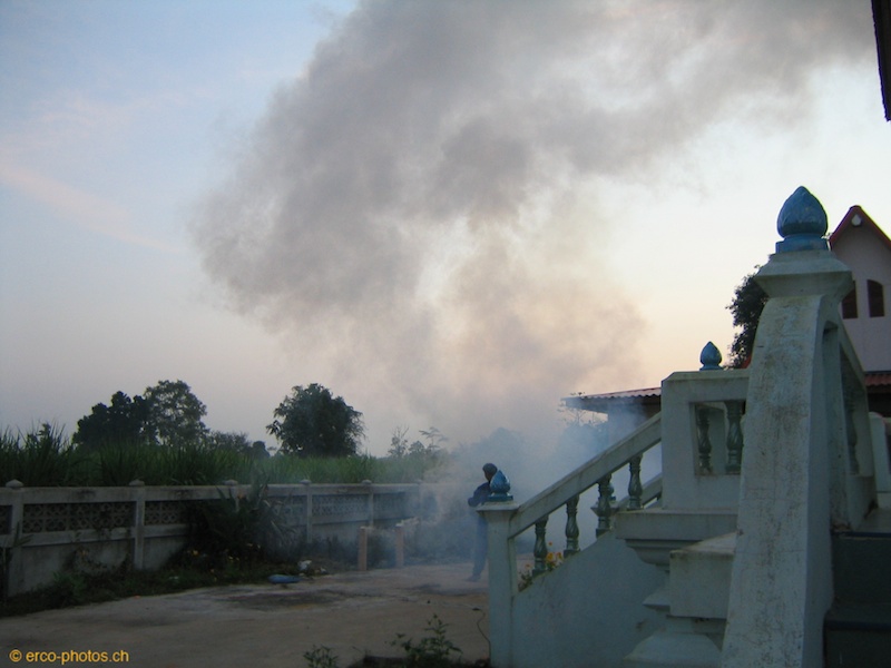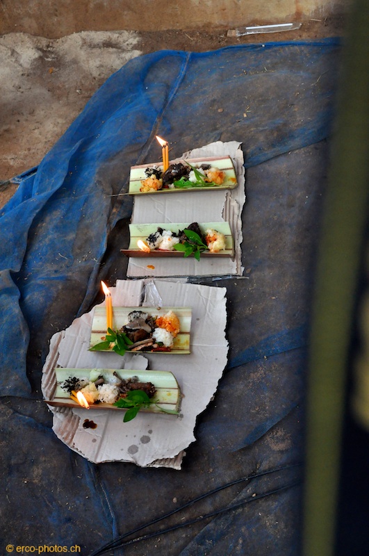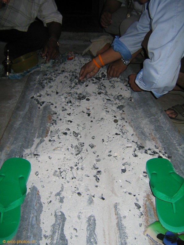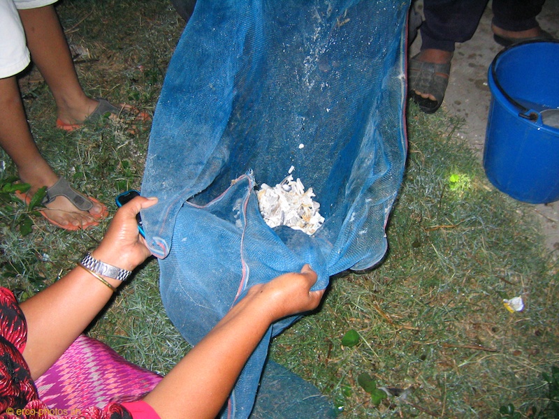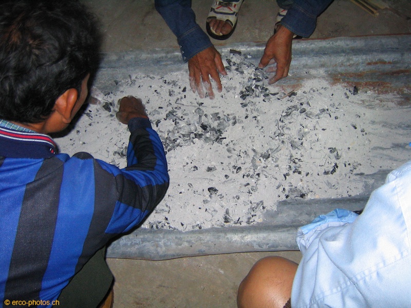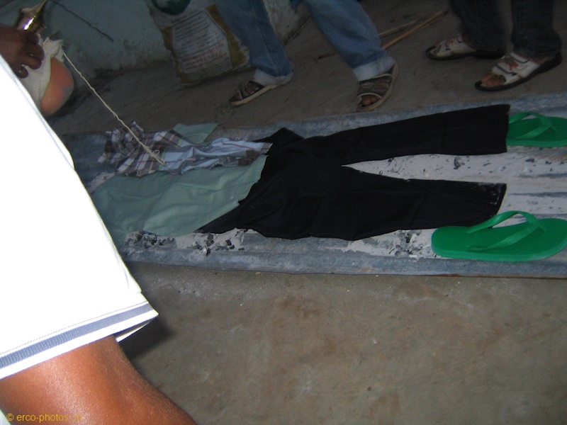 Le pétard d’une fusée me fait faire un saut dans mon lit à 5 heures du matin. Je suis seul. Tout le monde est parti au crématoire pour la levée des cendres. Celles-ci sont étalées sur une tôle et reconstituent sommairement le corps. Des habits du défunt sont posés dessus avec ses tongs. Cette reconstitution corporel est une image de sa future réincarnation. La suite varie selon les familles, soit les cendres sont enterrées sous un figuier sacré dans la cour du temple ou, pour dans ce cas, mises dans une urne conservée par la famille.
