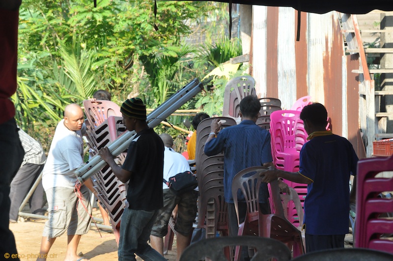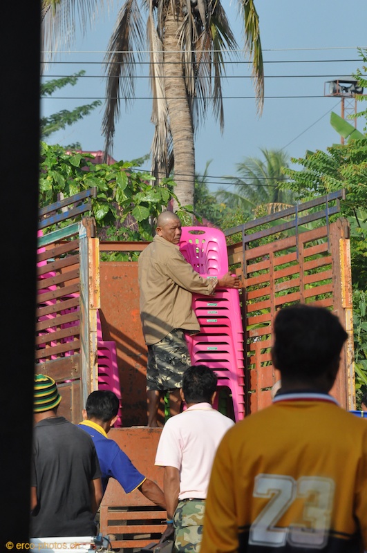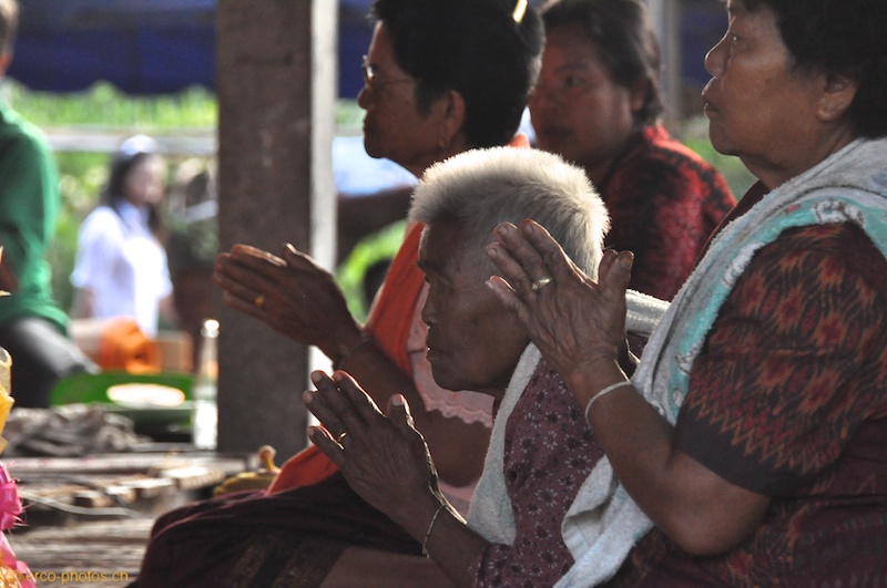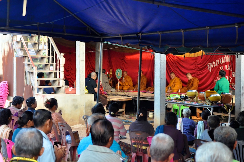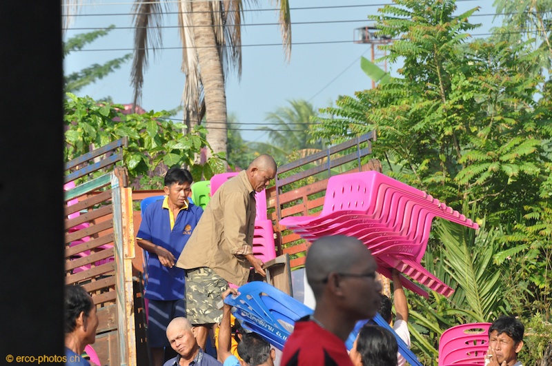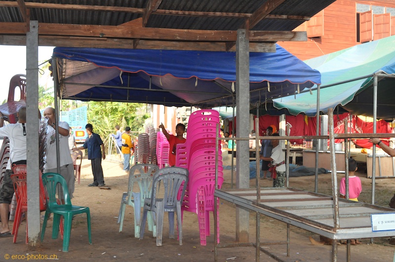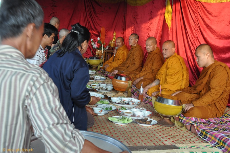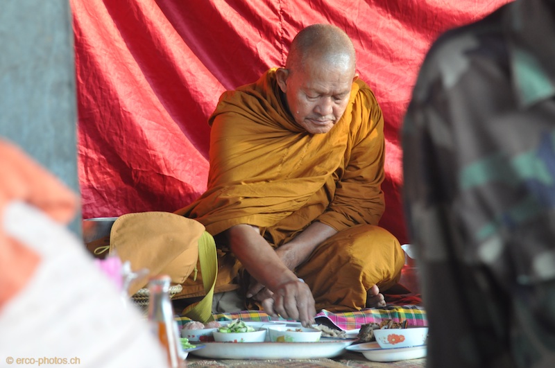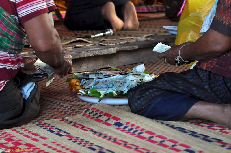 Dernière cérémonie religieuse. A 11 heures les 5 moines habituels viennent faire des prières avec la famille qui offre une dernier repas aux religieux. Nous sommes tous là devant eux à les regarder manger. Puis après leur départ, démontage des tentes et chargement sur les camionnettes des tables et chaises louées pour la circonstance. Je découvre à cet instant les branchements électriques à l’épingle de nourrice; pratique, mais combien dangereux (voir photo pour comprendre).