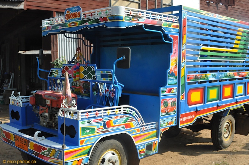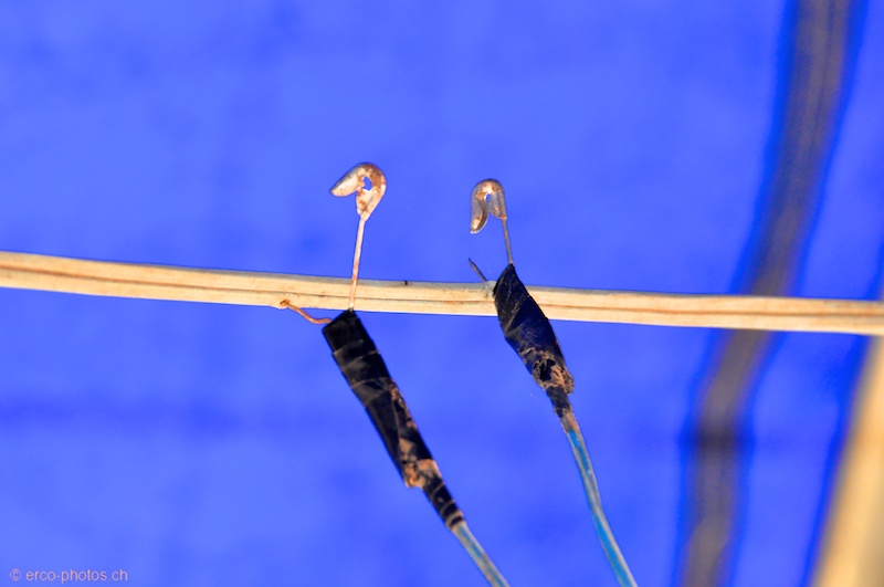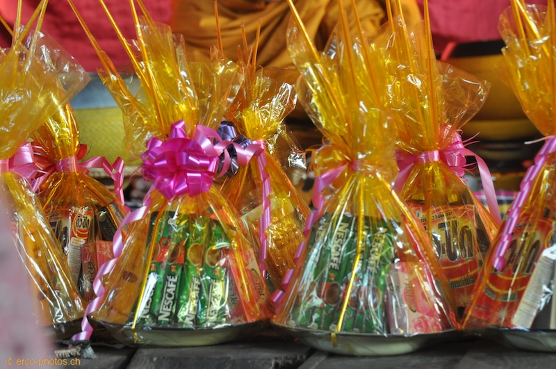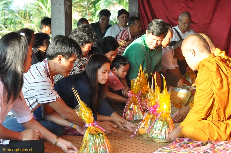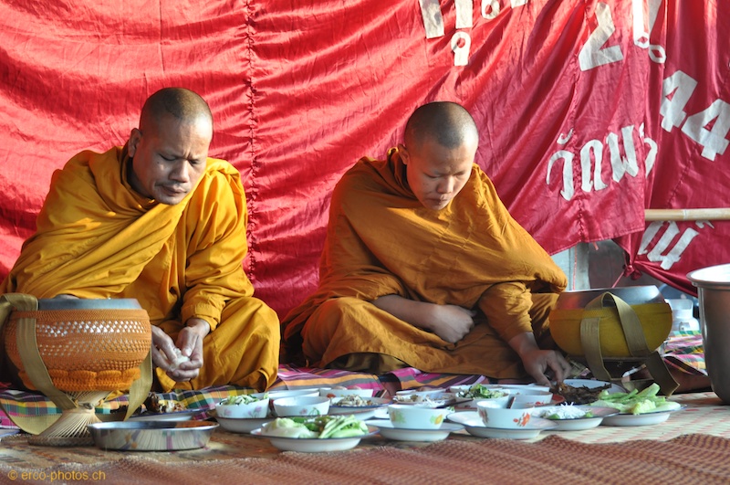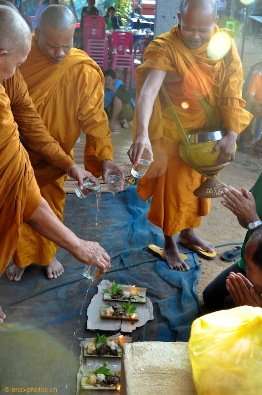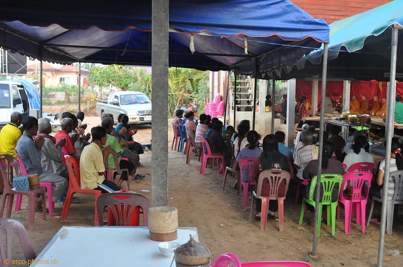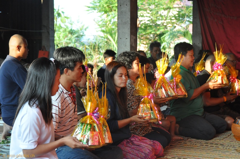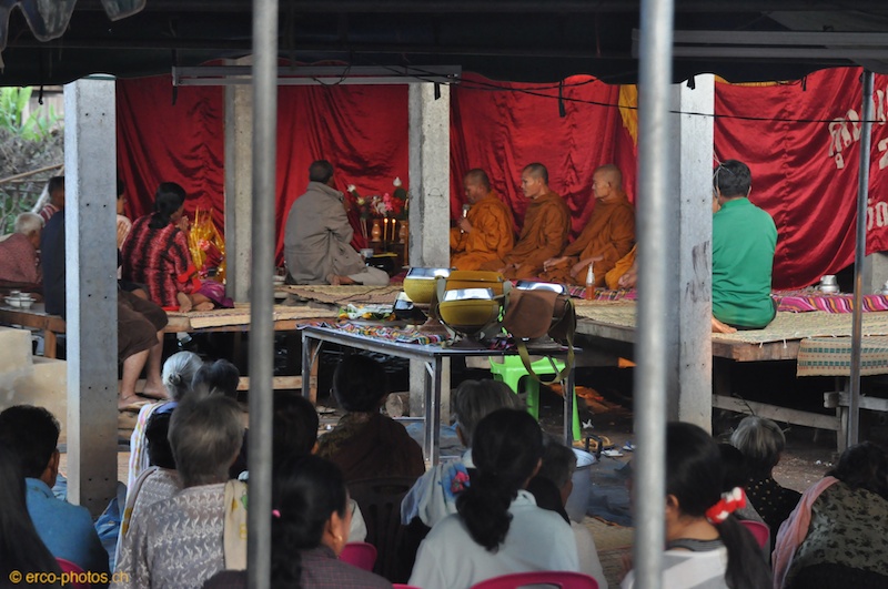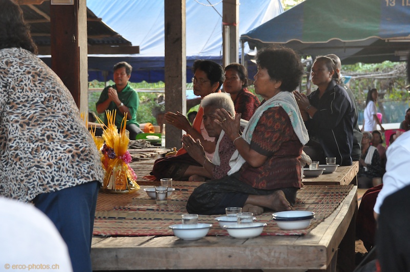 Dernière cérémonie religieuse. A 11 heures les 5 moines habituels viennent faire des prières avec la famille qui offre une dernier repas aux religieux. Nous sommes tous là devant eux à les regarder manger. Puis après leur départ, démontage des tentes et chargement sur les camionnettes des tables et chaises louées pour la circonstance. Je découvre à cet instant les branchements électriques à l’épingle de nourrice; pratique, mais combien dangereux (voir photo pour comprendre).