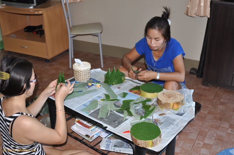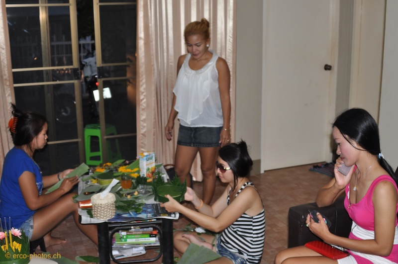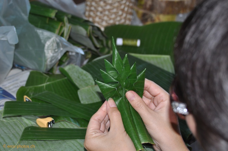 Tout commence l'après-midi par la confection des radeaux (les pas doués ou ceux qui travaillent peuvent les acheter sur place). Mon appartement s'est vite transformé en atelier de couture où les feuilles de bananiers à coups de ciseaux, de fil et d'aiguilles sont devenues les décorations de base d'un segment du tronc d’une vingtaine de centimètres de diamètre. La visite d'amies venues faire commentaires, remarques et coup de main sur les réalisations donnaient des airs de volière (pour le bruit).