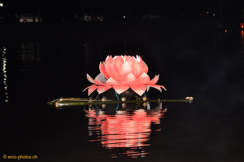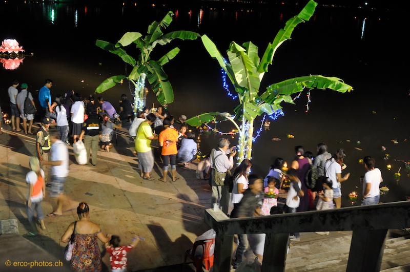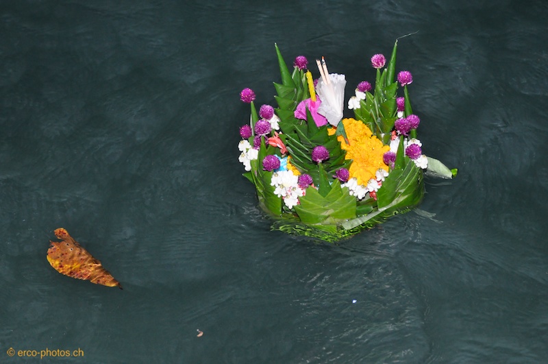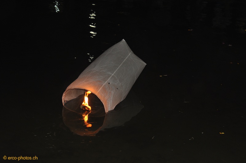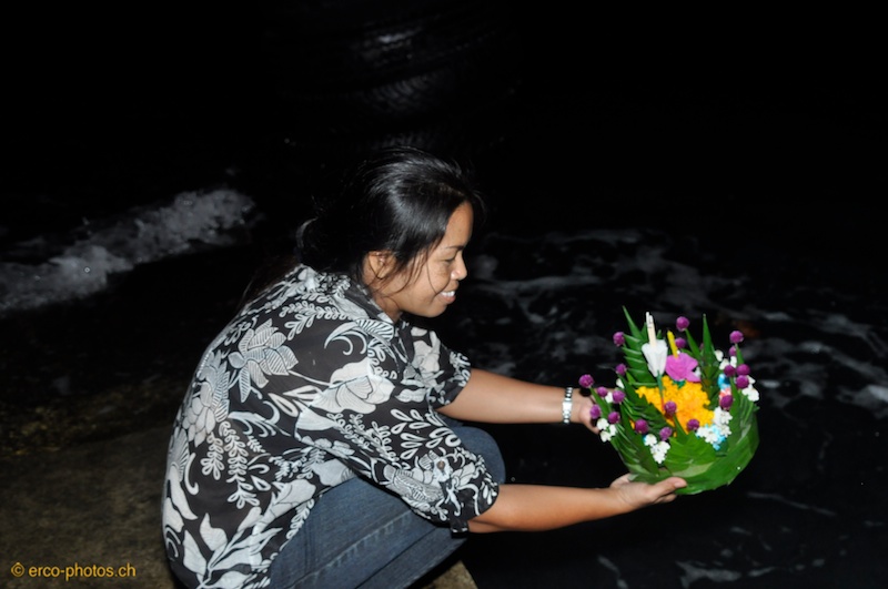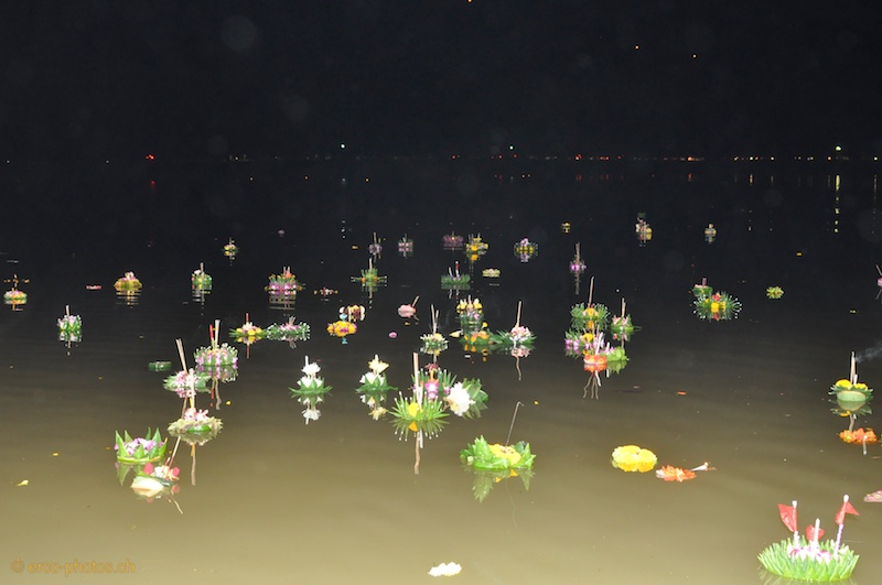 La nuit tombée, direction lac (mer ou rivière selon la région). La colonne de véhicules, qui à chaque carrefour mettent leur clignotant dans la même direction, confirme la popularité de la fête. On nous informe qu'au début de la soirée il fallait une heure pour s'approcher du lac. Heureusement que nous avons été retardé par la séance douche et maquillage des nanas et nous sommes arrivée vers 23 heures. Nous avons pu accéder facilement au plan d'eau et, après avoir invoqué Bouddha, allumé les bougies et l'encens, déposer notre radeau sur l'élément liquide et le pousser gentillement afin qu'il s'éloigne du bord.