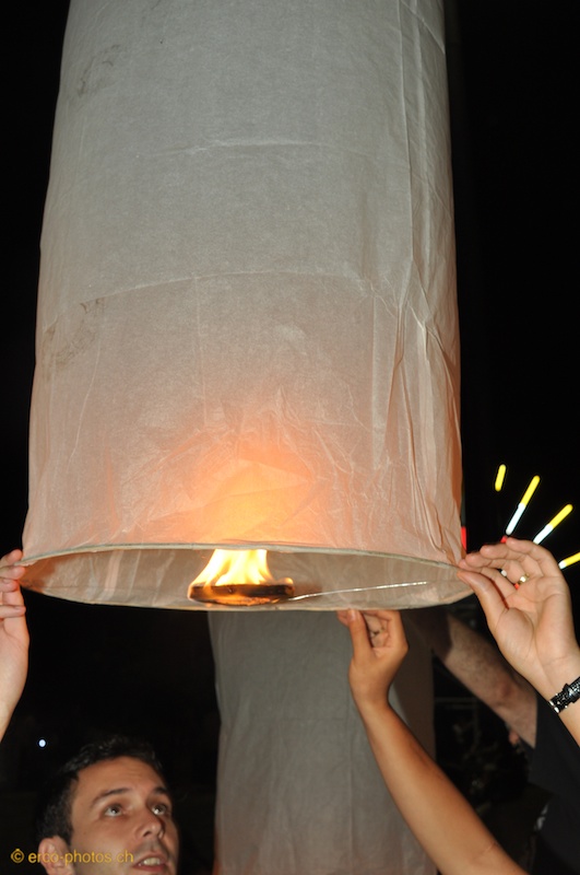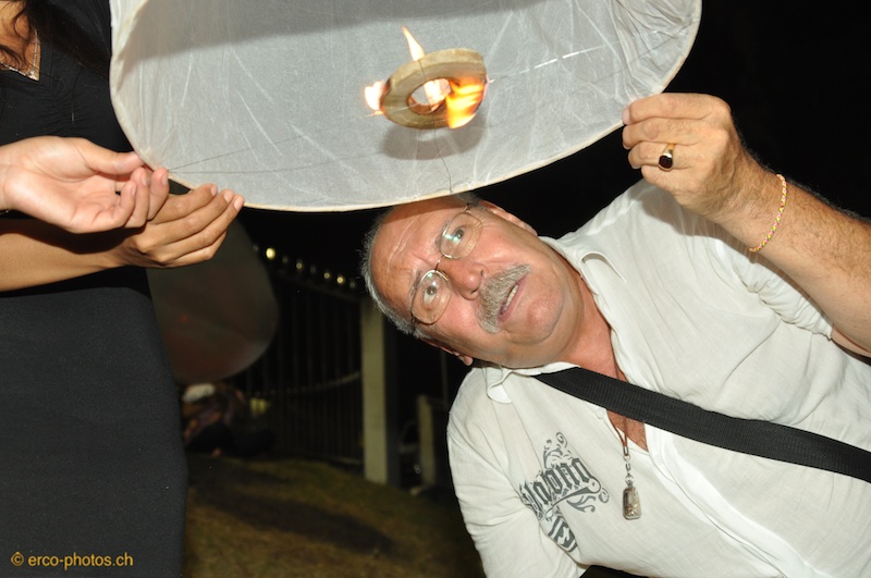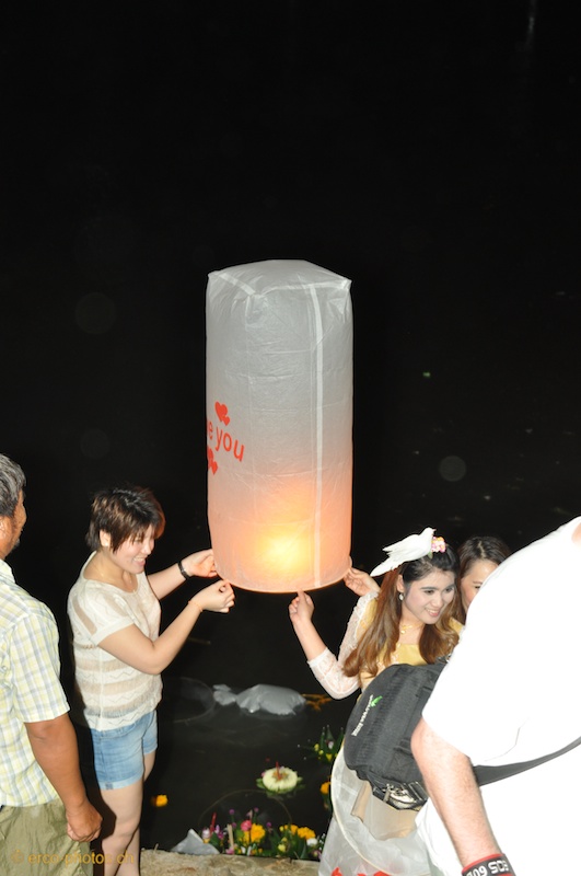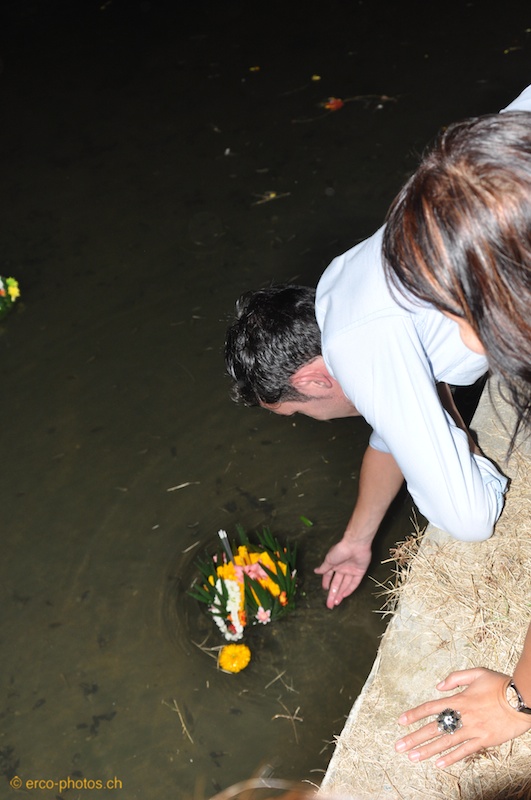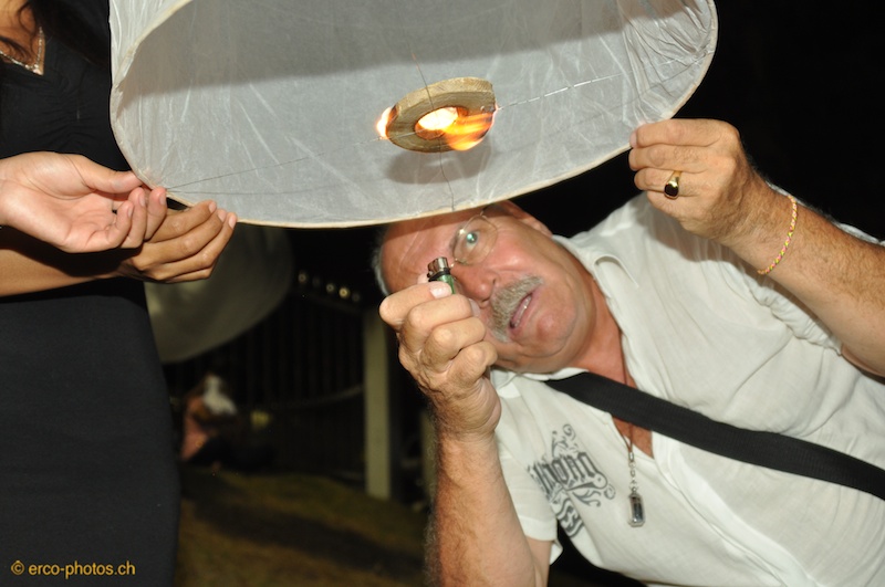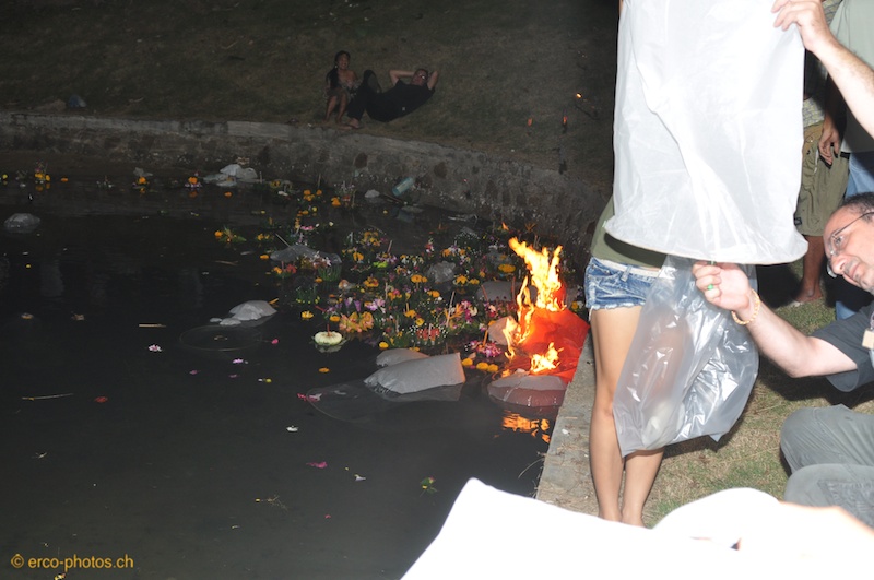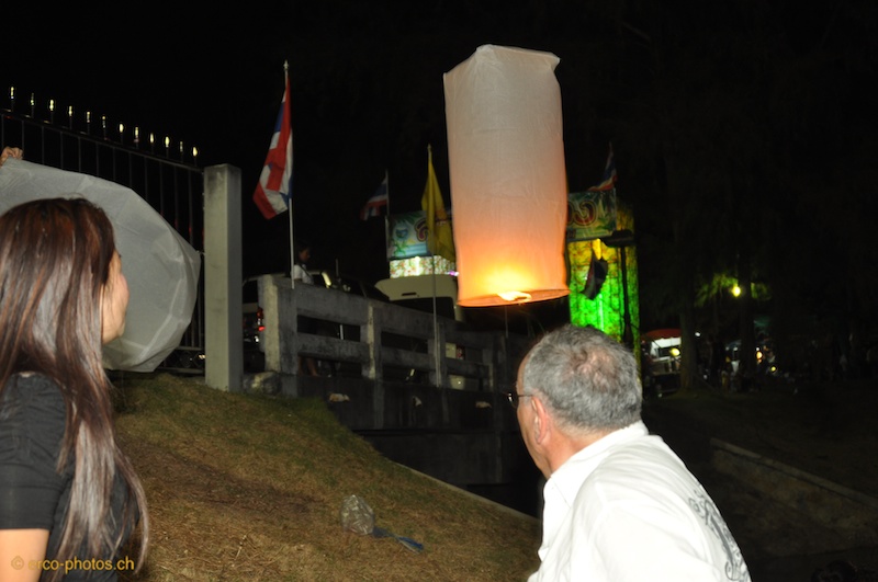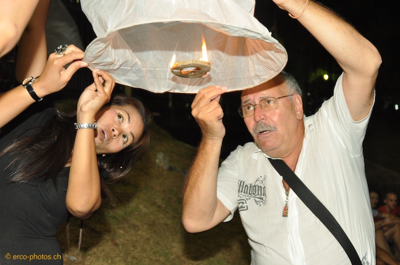Ensuite on passe à la 2ème phase de la cérémonie: le Khom faï. Ce sont des lanternes (montgolfières) de papier équipées, en dessous, d'un cercle de carton (?) que l'on allume et qu'on espère voir monter vers les étoiles pour confirmer l'intensité de l'amour des 2 tourtereaux. Si votre Khom faï retombe lamentablement dans l'eau ou s'accroche dans les branche d'un arbre… c'est le divorce dans l'année. Cet incident étant arrivé, un soir, à un couple d'amis; ils se sont empressés d'en acheter un autre pour réitérer l'opération. Ouf! cette fois il est monté dans les cieux et ils ne l'ont quitté des yeux que lorsqu'il était plus visible.