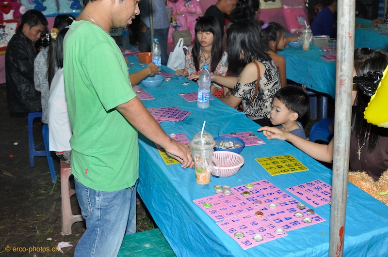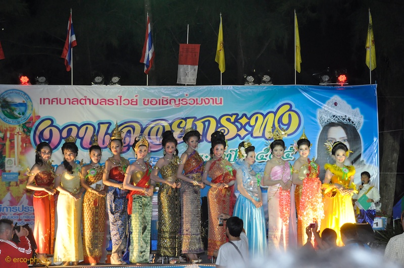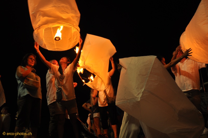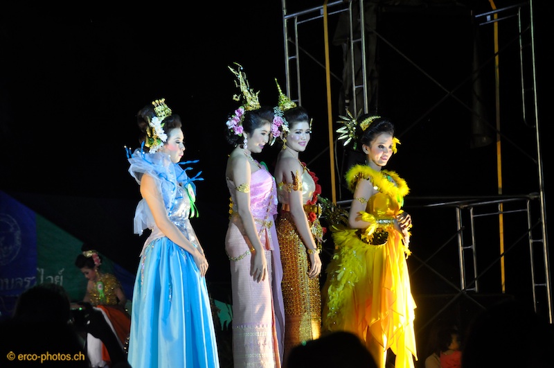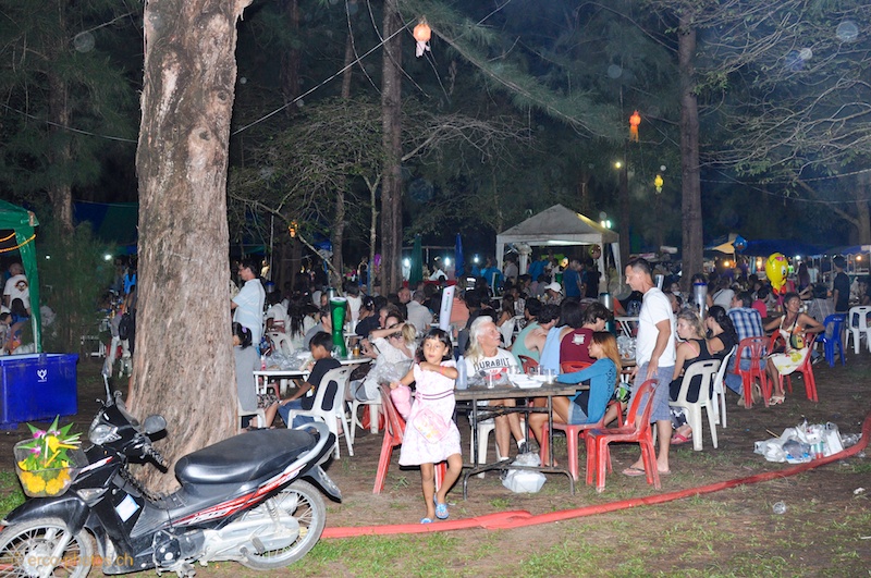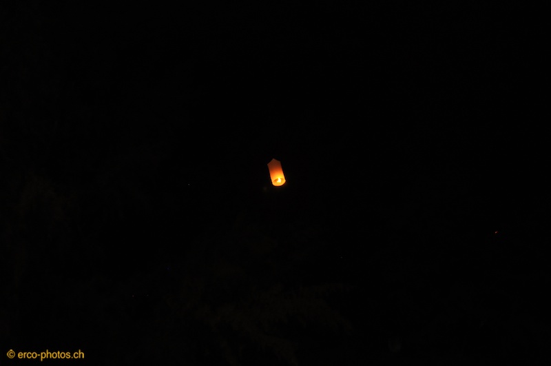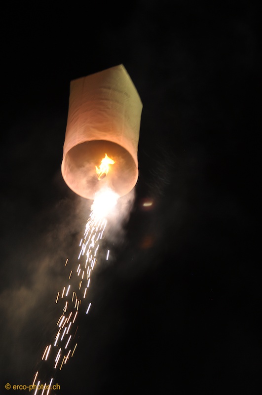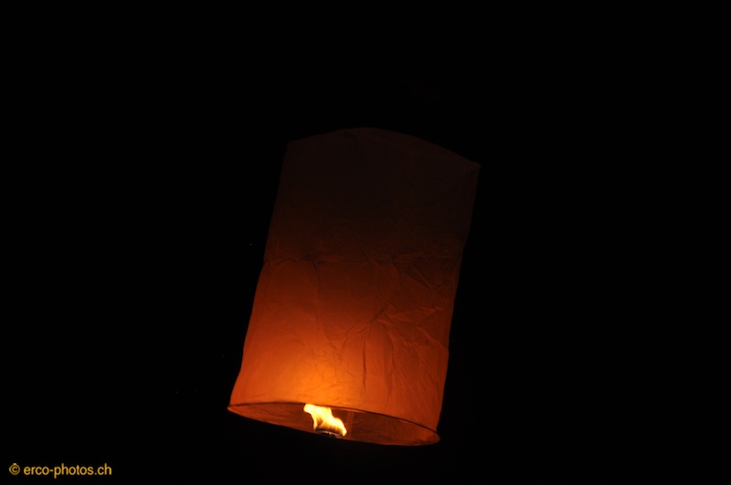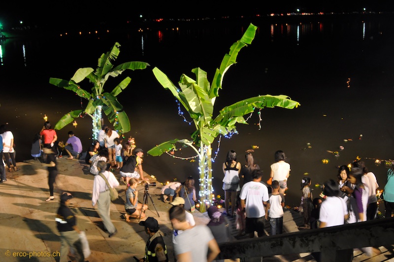 Ensuite on passe à la 2ème phase de la cérémonie: le Khom faï. Ce sont des lanternes (montgolfières) de papier équipées, en dessous, d'un cercle de carton (?) que l'on allume et qu'on espère voir monter vers les étoiles pour confirmer l'intensité de l'amour des 2 tourtereaux. Si votre Khom faï retombe lamentablement dans l'eau ou s'accroche dans les branche d'un arbre… c'est le divorce dans l'année. Cet incident étant arrivé, un soir, à un couple d'amis; ils se sont empressés d'en acheter un autre pour réitérer l'opération. Ouf! cette fois il est monté dans les cieux et ils ne l'ont quitté des yeux que lorsqu'il était plus visible.