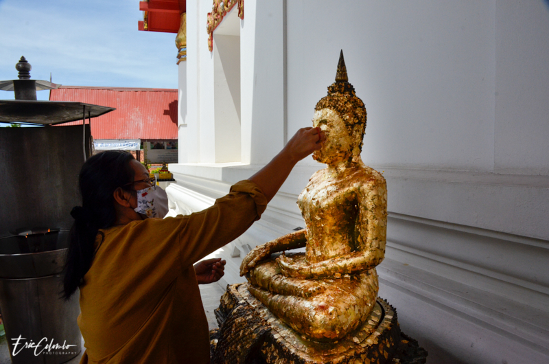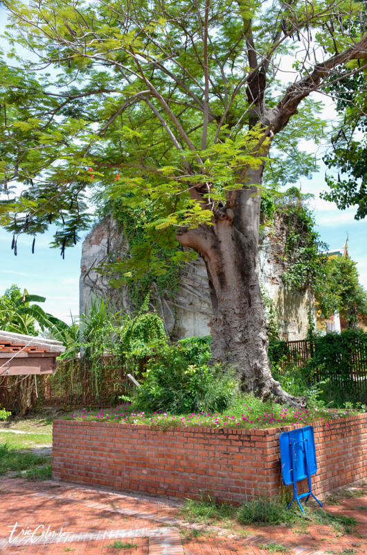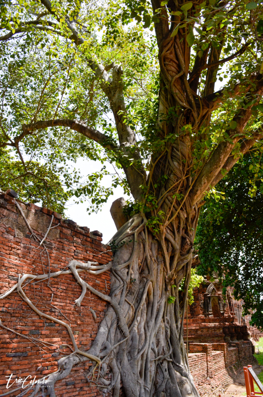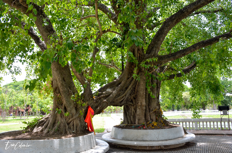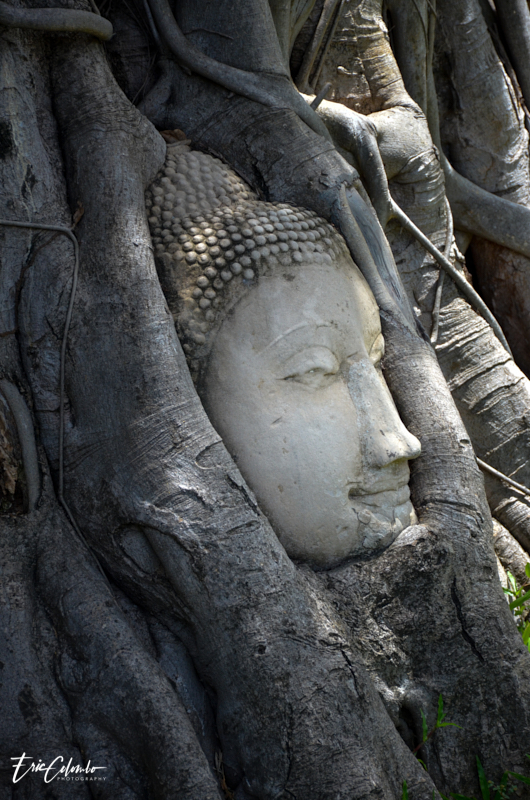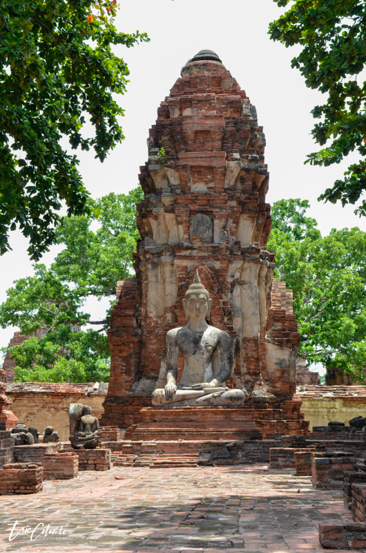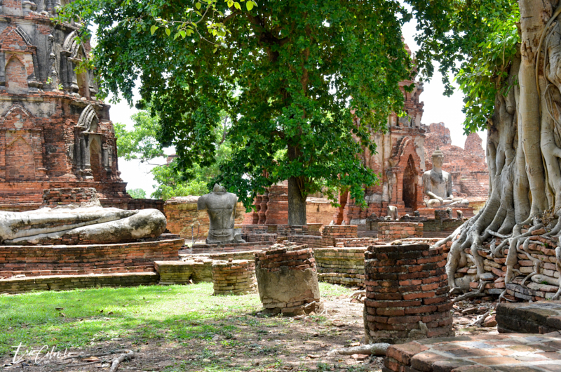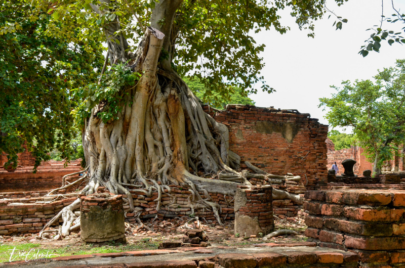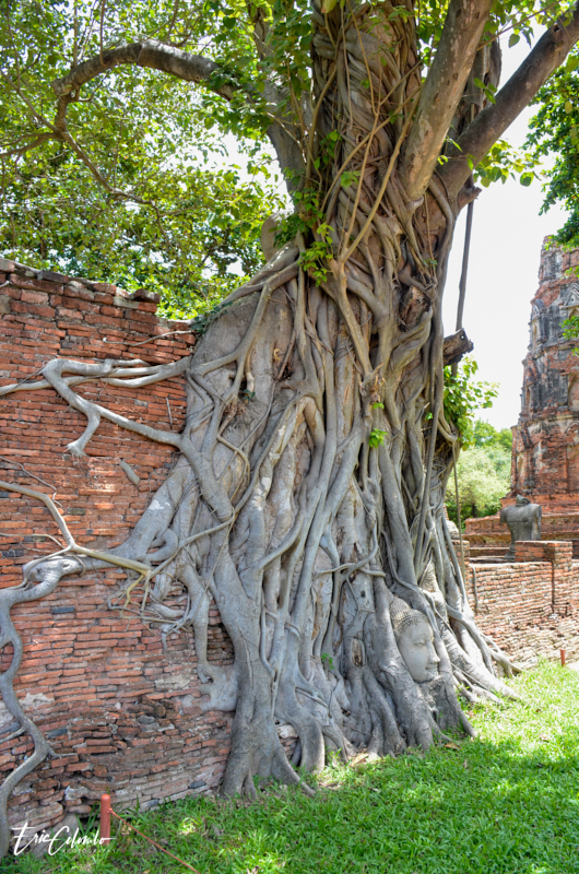 Ensuite le Wat Mahathat (photos 24 à 39) construit à la même époque de la création de la ville, les ruines laissent apparaitre que la majorité des statues en pierre de Bouddha sont décapitées. Les troupes birmanes ne toléraient pas que Bouddha soit représenté dans une autre matière que l’or. On trouve ces têtes un peu partout et l’une d’elles est enchâssée dans les racines d’un arbre banyan (figuier sacré) (photos 30 & 31). Le banyan a la particularité d’avoir des branches qui deviennent racines et/ou des racines qui deviennent des branches. Il enveloppe l’arbre qu’il a choisi comme tuteur et ce dernier disparaitra dans l’enchevêtrement de ses membres tentaculaires. On peut ainsi voir des banians de très grande taille envahir peu à peu des espaces et manger totalement les barrières, murets, bicoques, temples, etc.