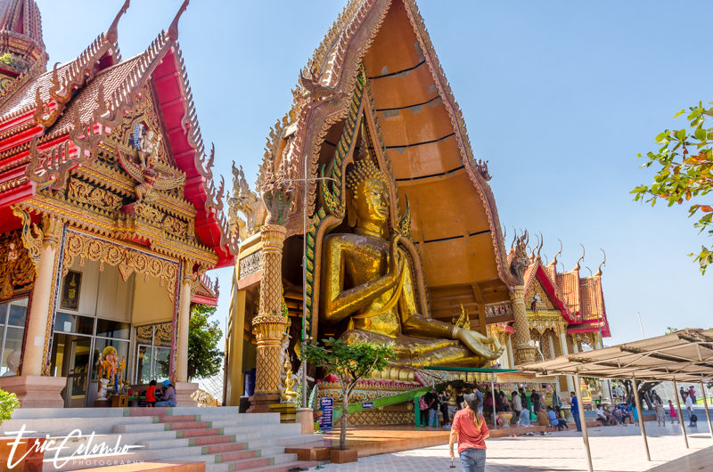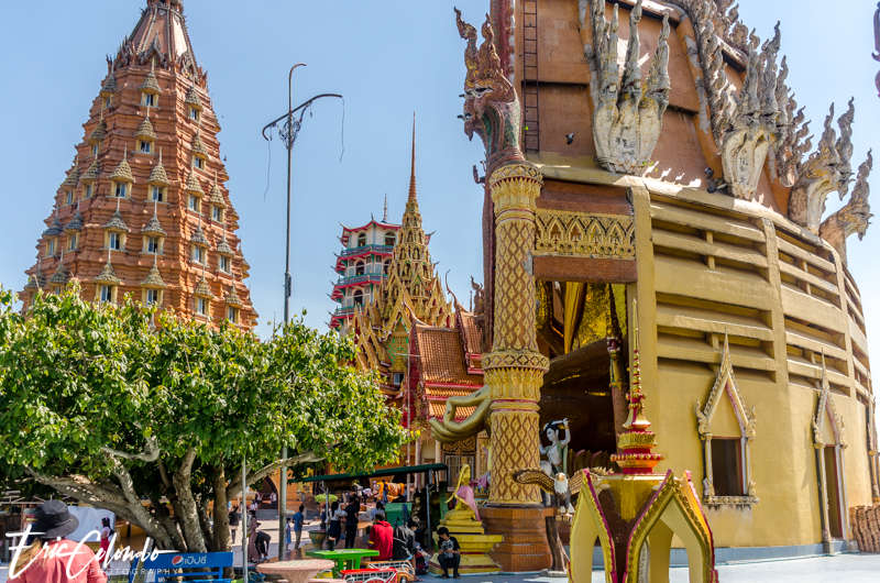 Le Wat Tham Suea se situe à une quinzaine de kilomètres de la ville de Kanchanaburi. Ce temple récent, sa construction date de 1971, dans le pur style thaï est perché sur une petite colline. Il possède un immense Bouddha assis de 18 mètres de haut et 10 mètres de large recouvert de mosaïques dorées, visible de loin, construit en 1973.