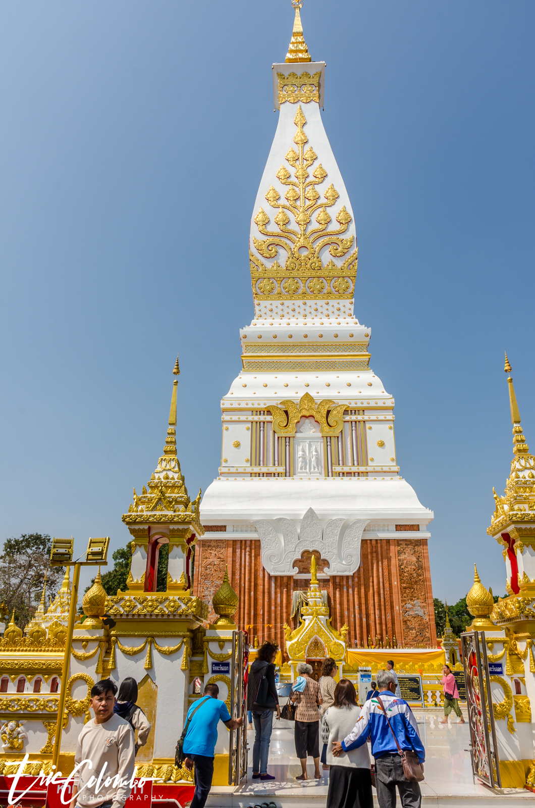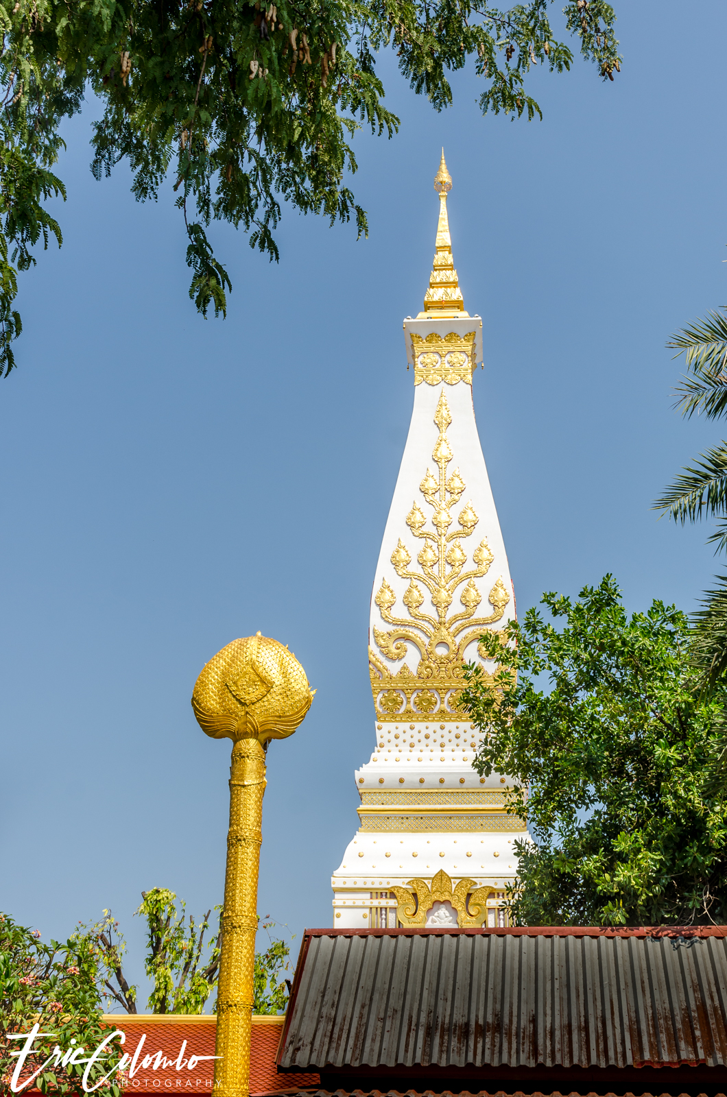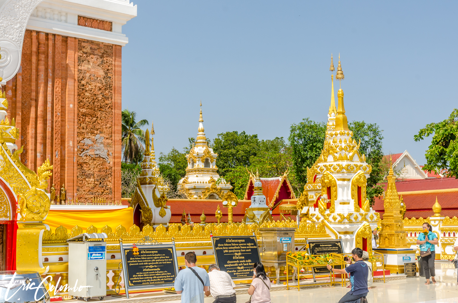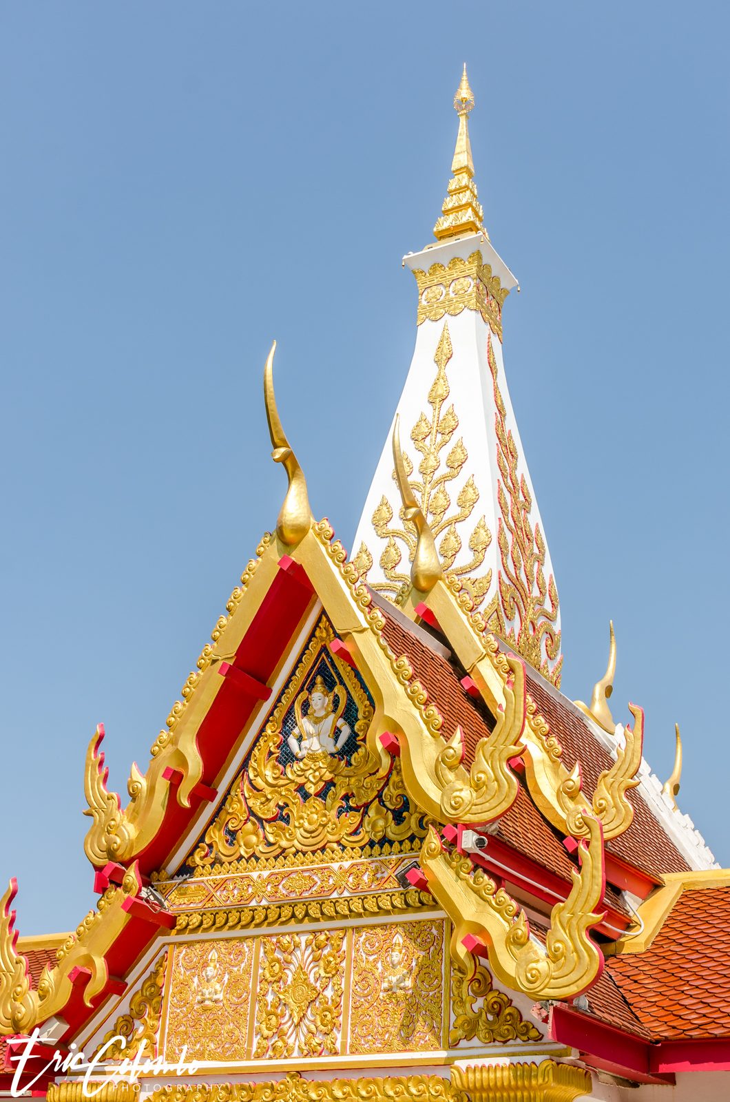 Le temple, de style laotien, avec un chédi(1) qui s'éleve à 57 mètres dans le ciel et qui possède 110 kilogrammes d'or dans sa conception, a été accepté à titre préliminaire comme candidat sur la liste des sites considérés comme sites du patrimoine mondial de l'UNESCO cette année. Ce temple offre une autre particularité que je n’ai jamais vu ailleurs, la surface autour du chédi est composée de plaque de marbre blanc. Avec le soleil, il serait impossible de marcher dessus sans se brûler la plante des pieds, mais ils ont installé un système de refroidissement sous les plaques; vous marchez sur un sol très frais, très agréable.