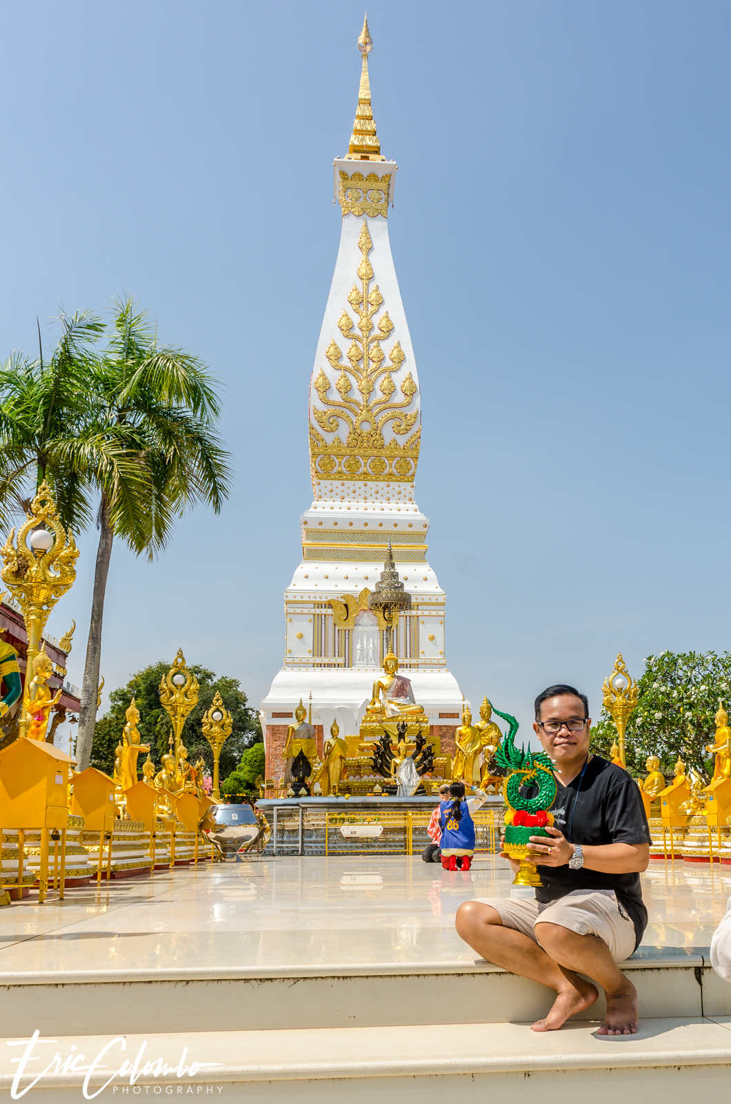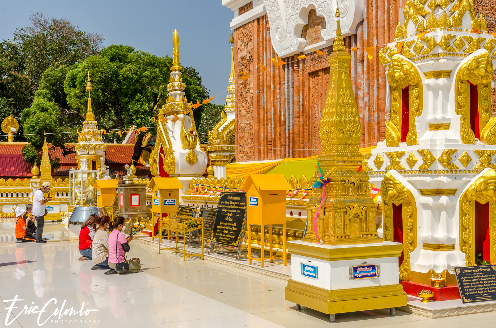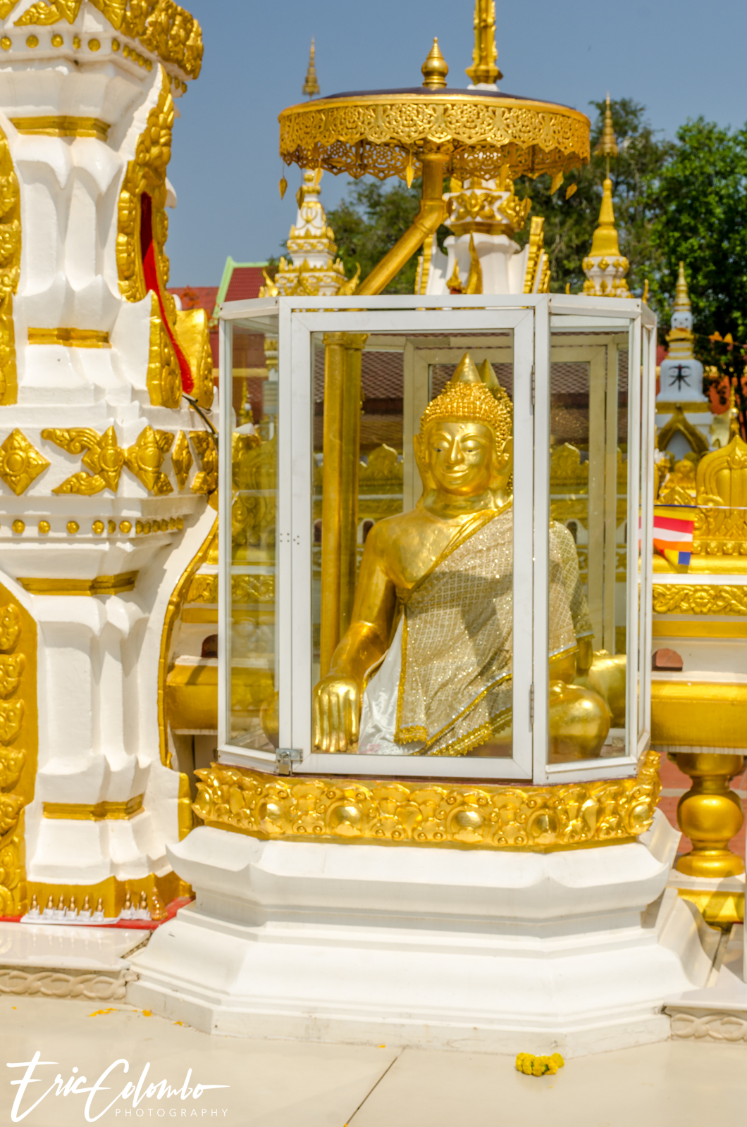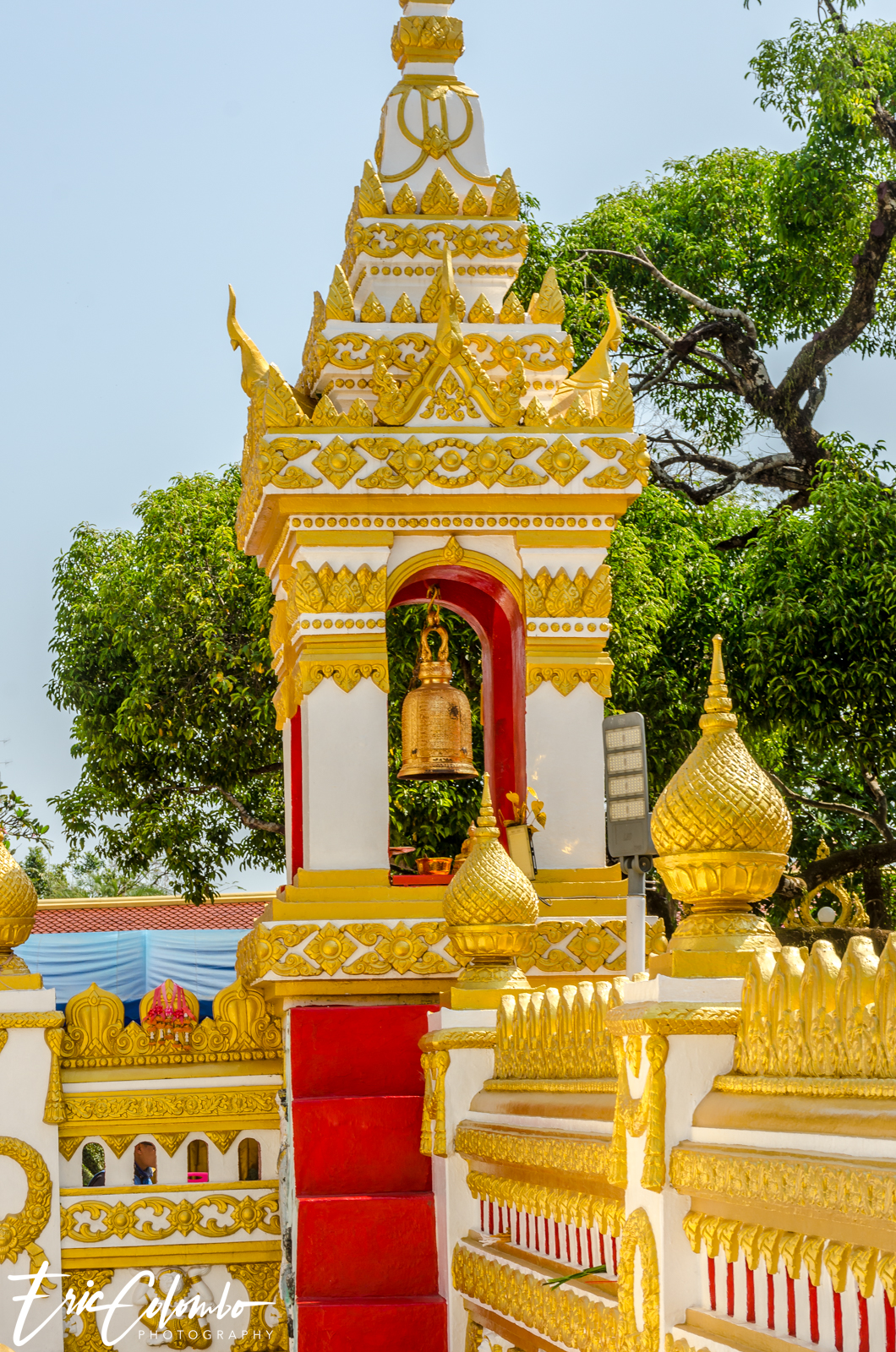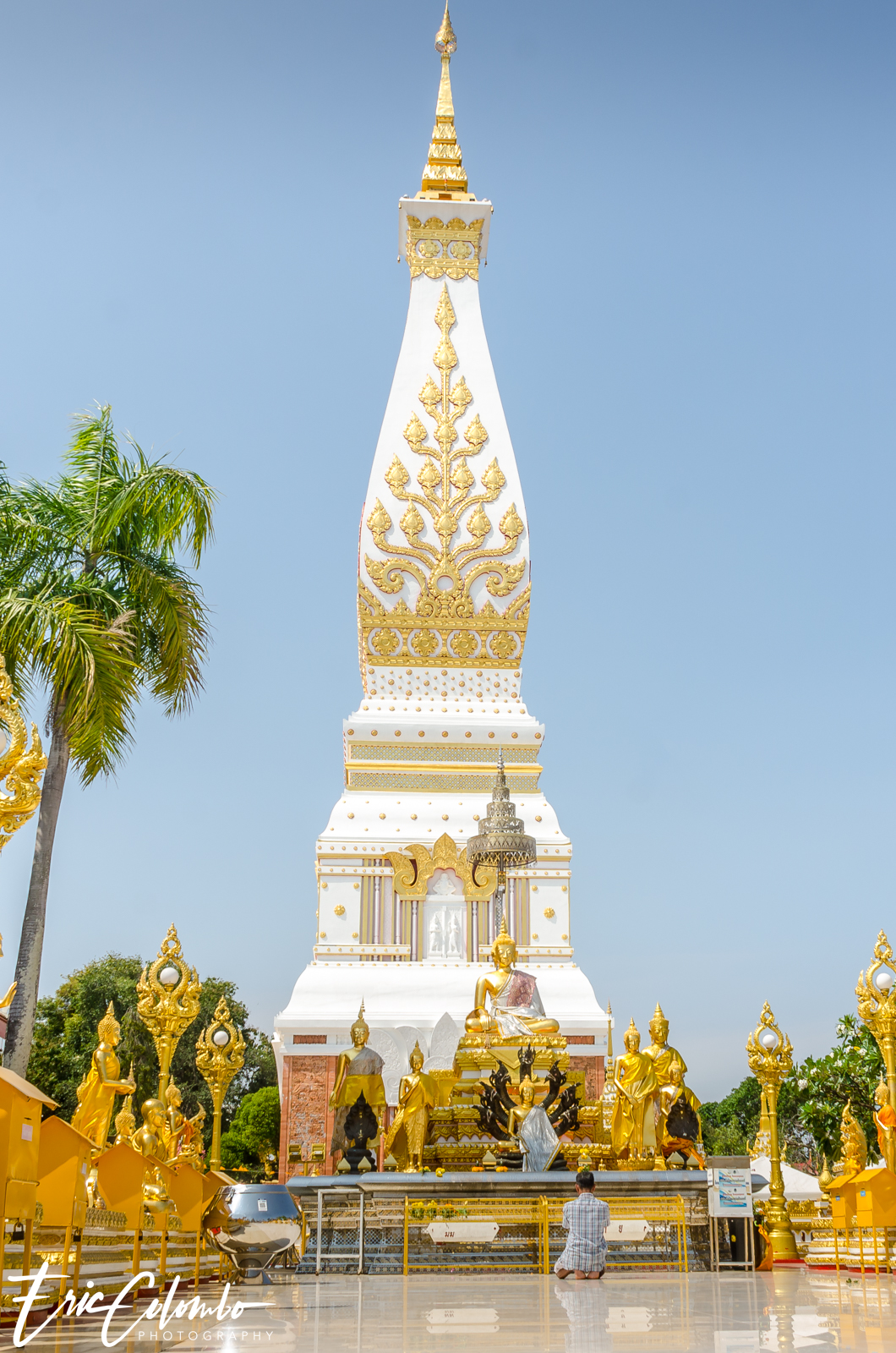 Le temple, de style laotien, avec un chédi(1) qui s'éleve à 57 mètres dans le ciel et qui possède 110 kilogrammes d'or dans sa conception, a été accepté à titre préliminaire comme candidat sur la liste des sites considérés comme sites du patrimoine mondial de l'UNESCO cette année. Ce temple offre une autre particularité que je n’ai jamais vu ailleurs, la surface autour du chédi est composée de plaque de marbre blanc. Avec le soleil, il serait impossible de marcher dessus sans se brûler la plante des pieds, mais ils ont installé un système de refroidissement sous les plaques; vous marchez sur un sol très frais, très agréable.