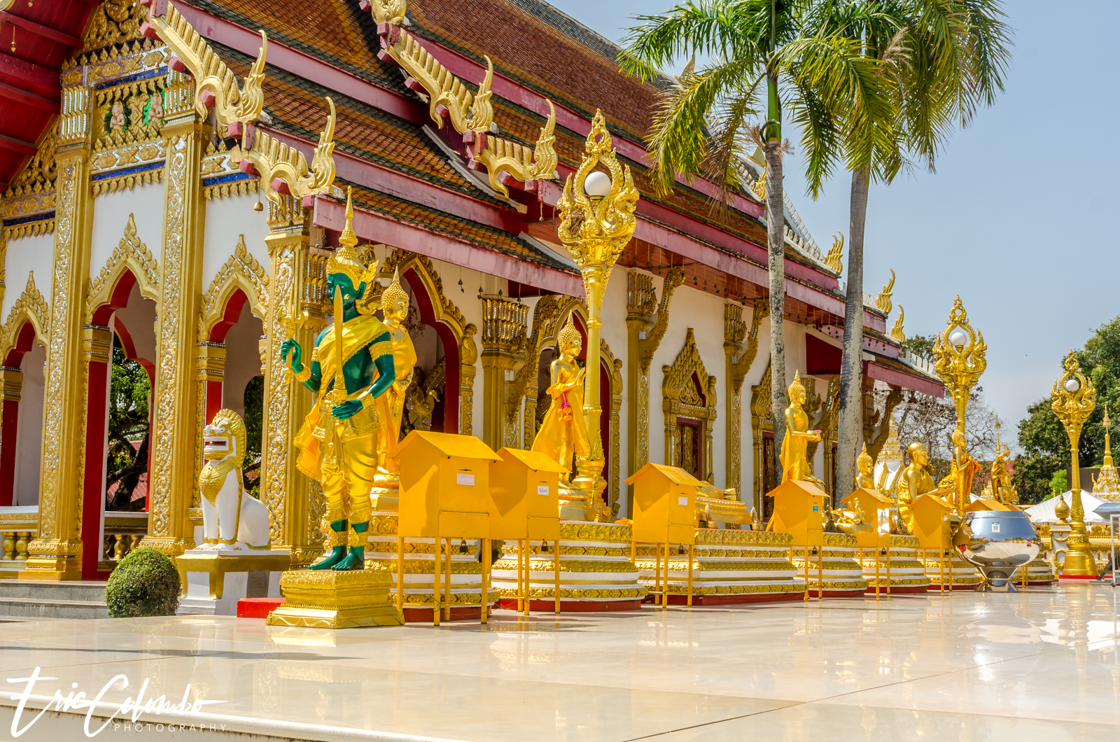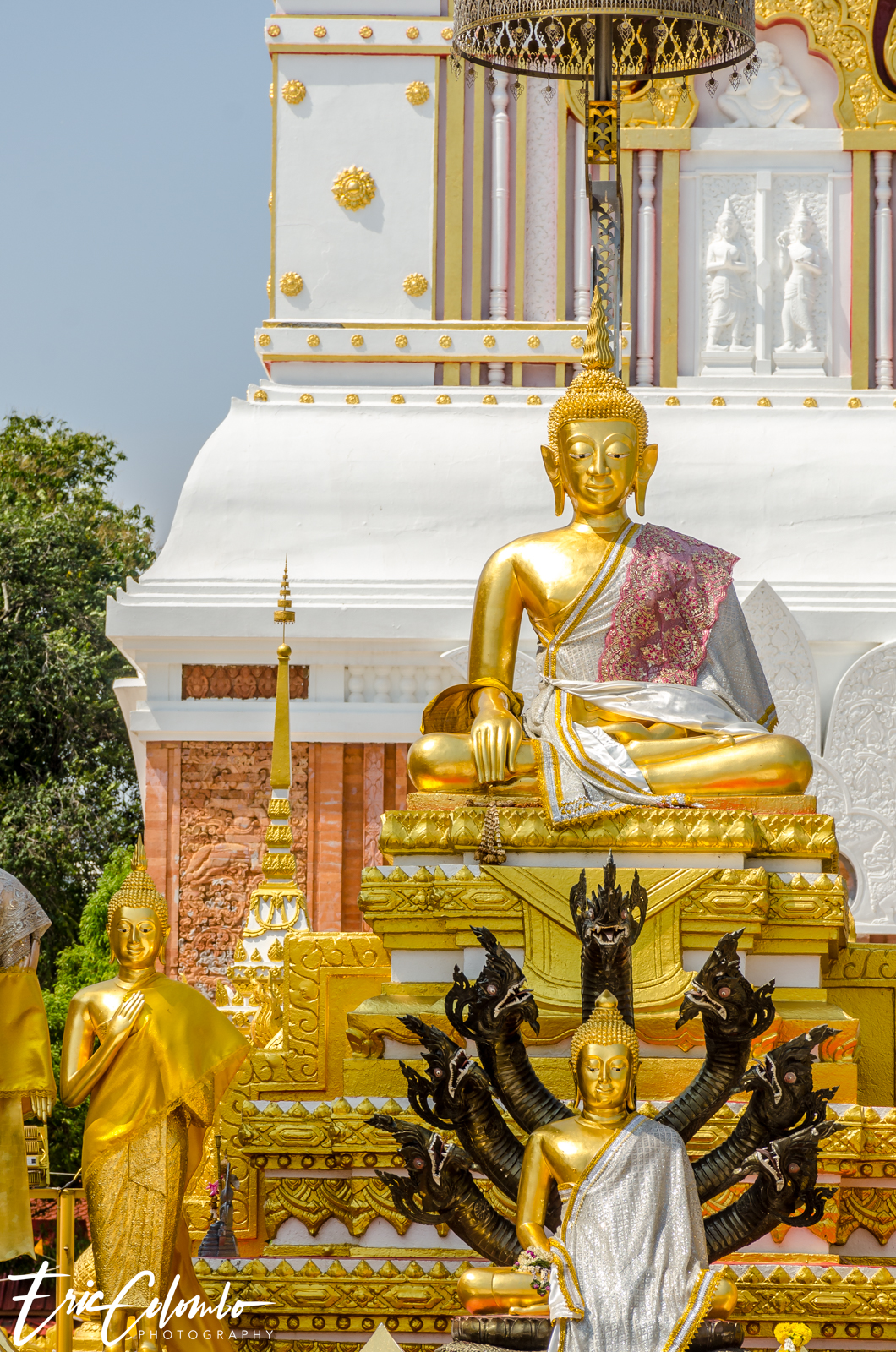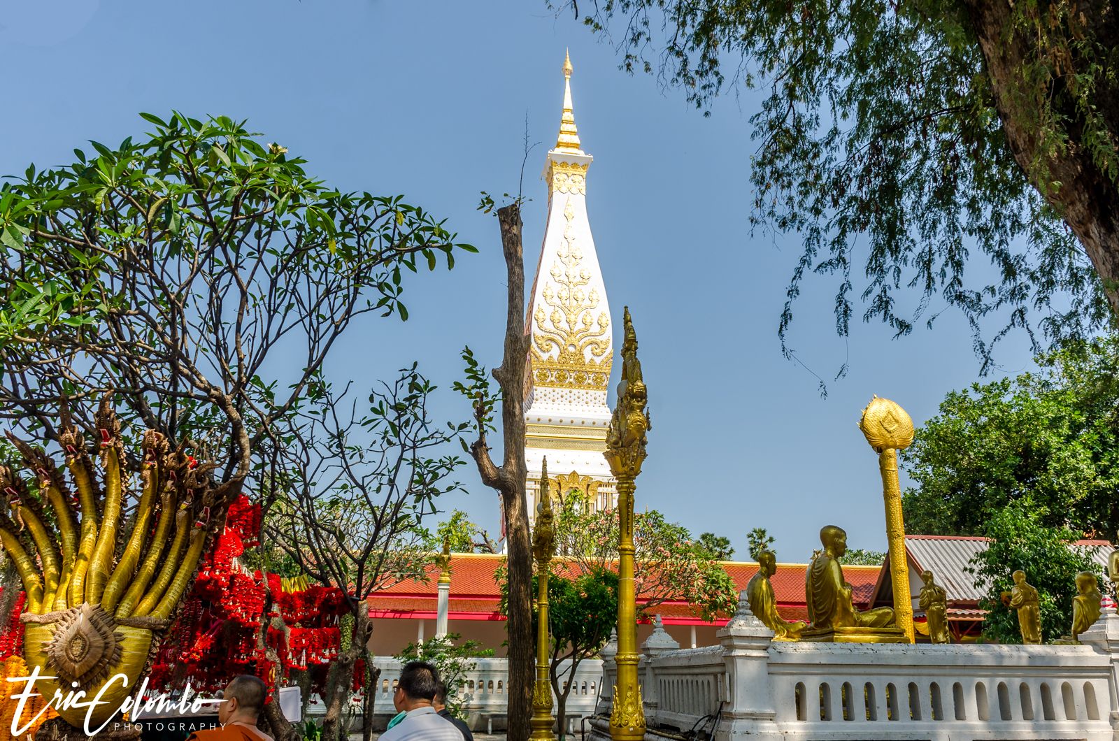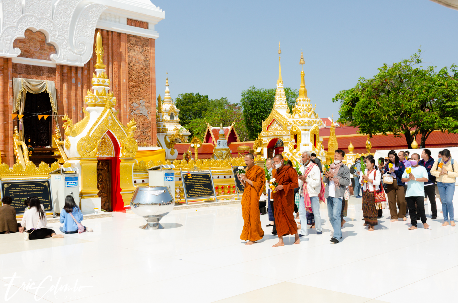 Le temple, de style laotien, avec un chédi(1) qui s'éleve à 57 mètres dans le ciel et qui possède 110 kilogrammes d'or dans sa conception, a été accepté à titre préliminaire comme candidat sur la liste des sites considérés comme sites du patrimoine mondial de l'UNESCO cette année. Ce temple offre une autre particularité que je n’ai jamais vu ailleurs, la surface autour du chédi est composée de plaque de marbre blanc. Avec le soleil, il serait impossible de marcher dessus sans se brûler la plante des pieds, mais ils ont installé un système de refroidissement sous les plaques; vous marchez sur un sol très frais, très agréable.