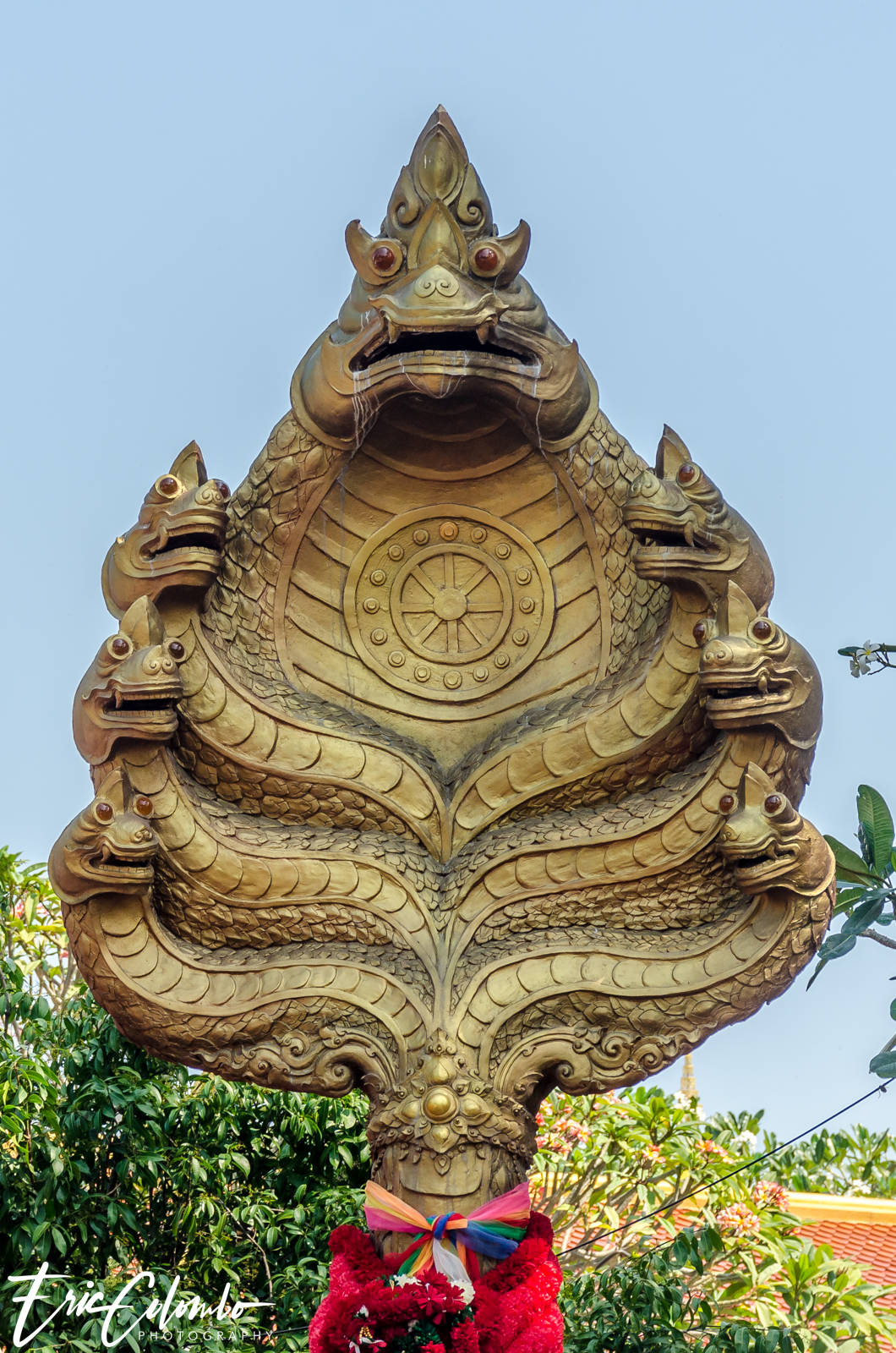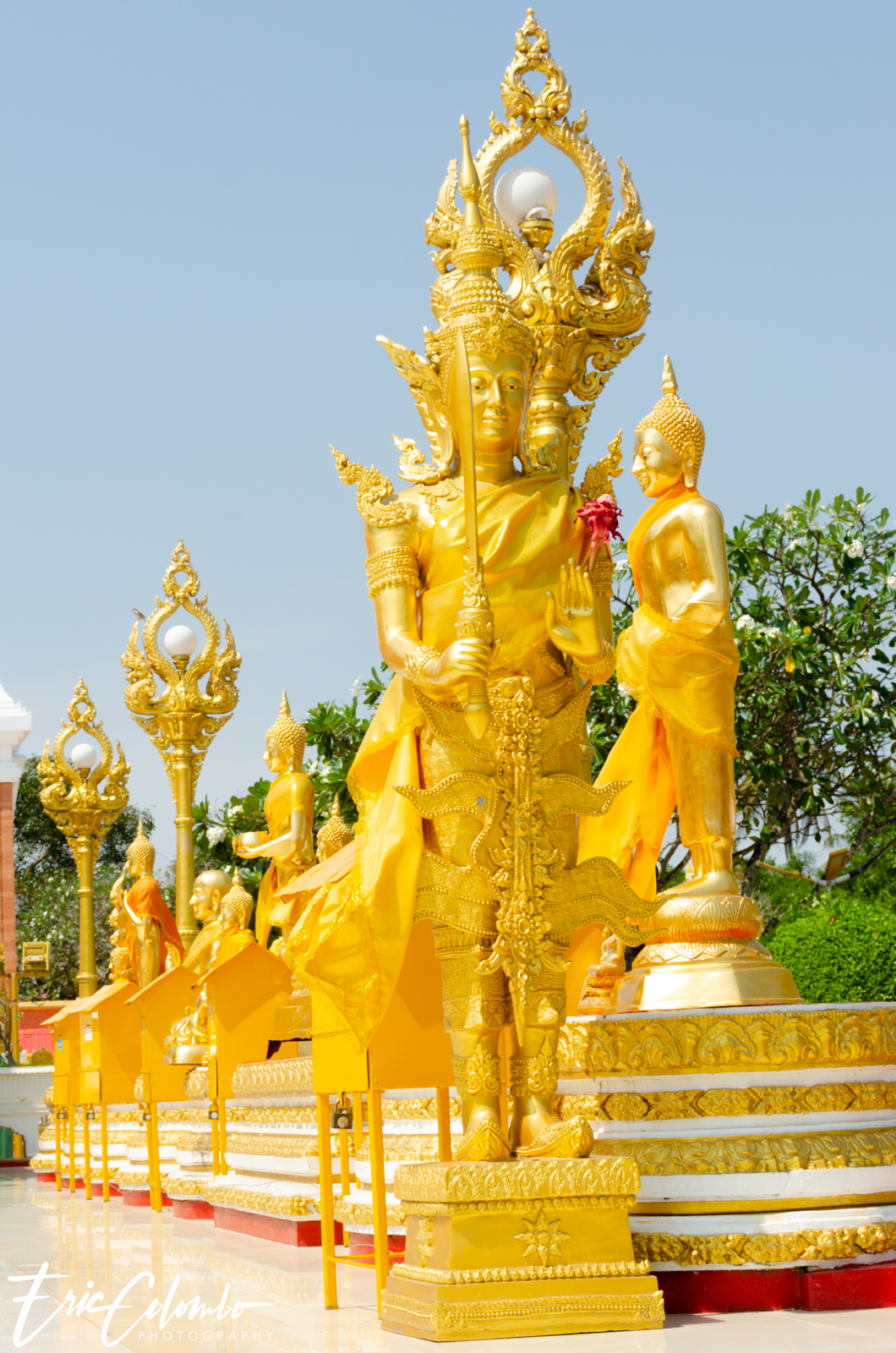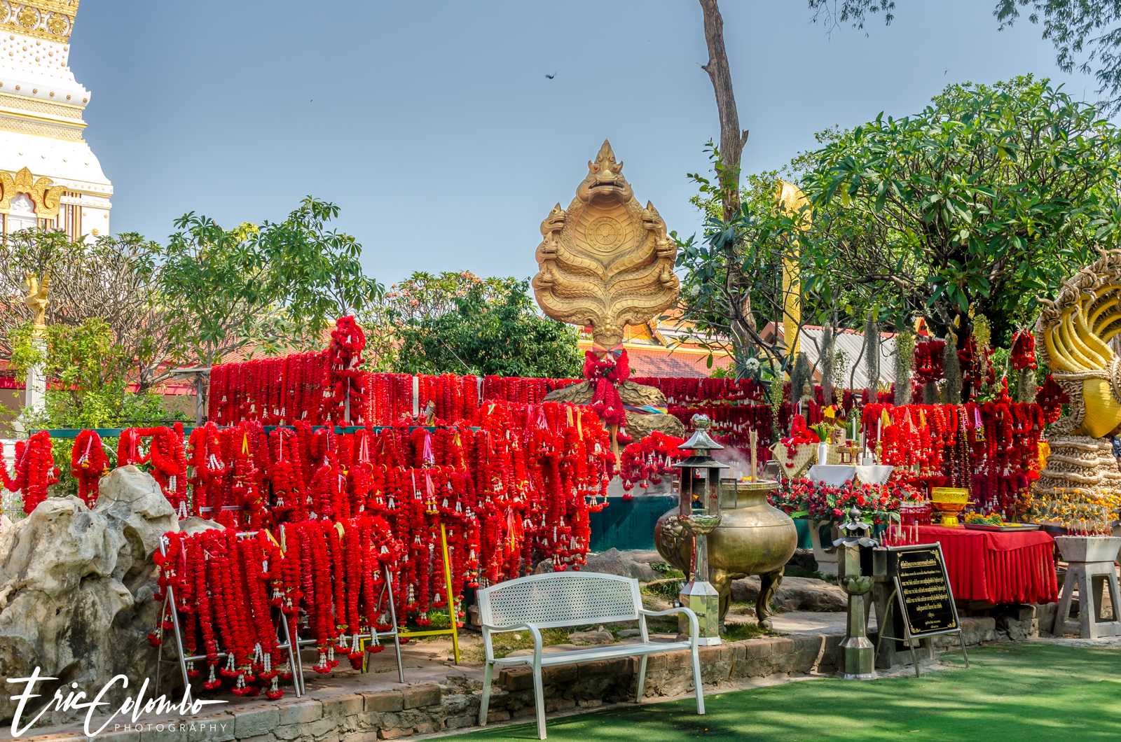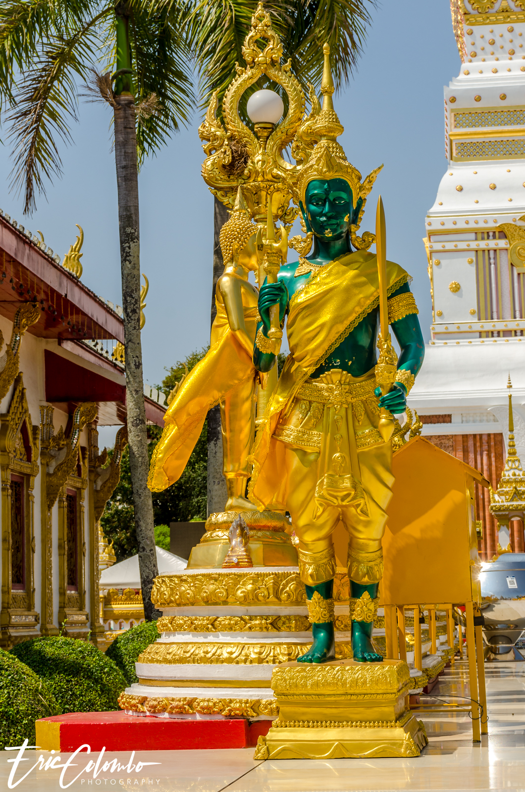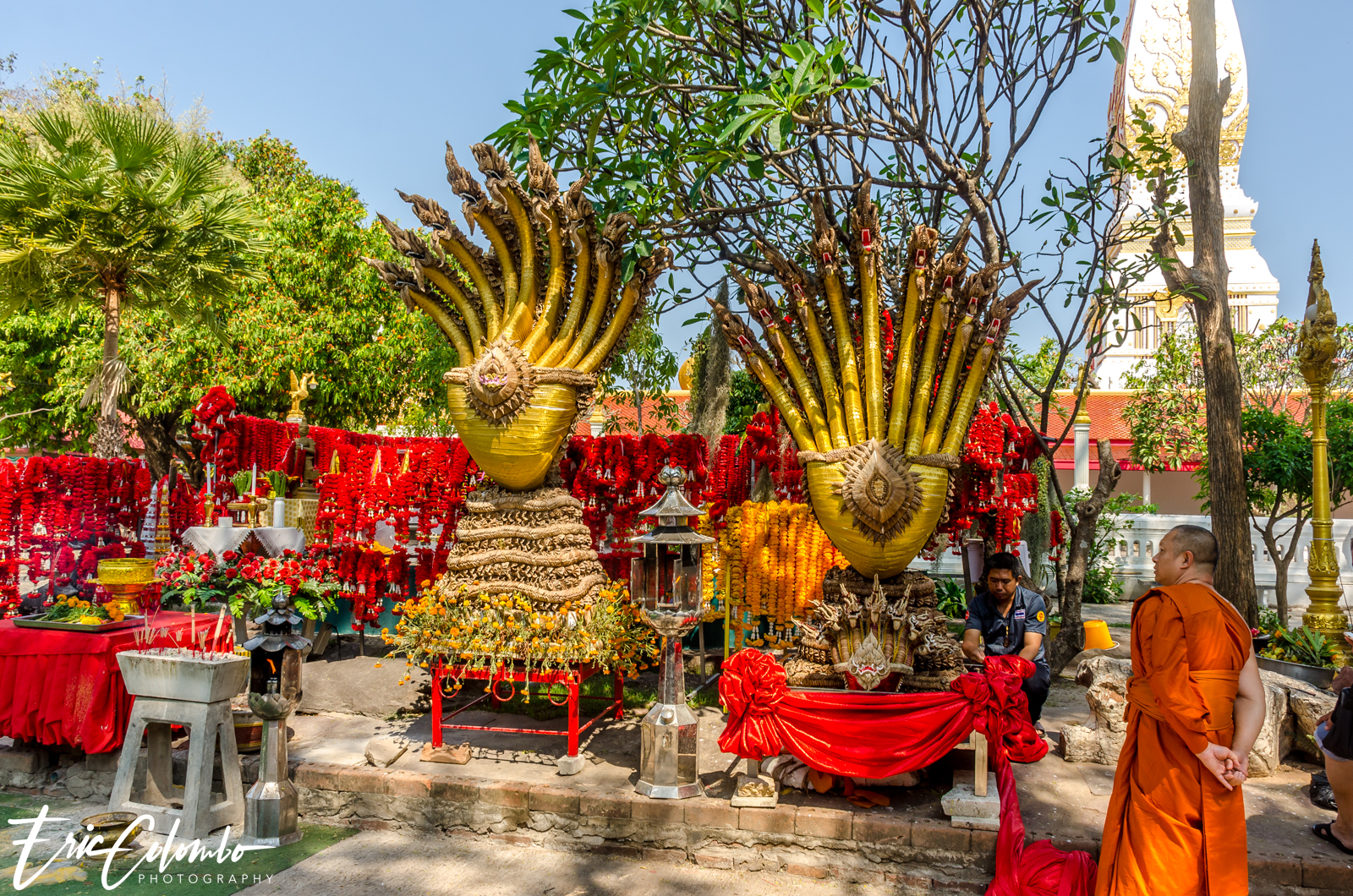 Le temple, de style laotien, avec un chédi(1) qui s'éleve à 57 mètres dans le ciel et qui possède 110 kilogrammes d'or dans sa conception, a été accepté à titre préliminaire comme candidat sur la liste des sites considérés comme sites du patrimoine mondial de l'UNESCO cette année. Ce temple offre une autre particularité que je n’ai jamais vu ailleurs, la surface autour du chédi est composée de plaque de marbre blanc. Avec le soleil, il serait impossible de marcher dessus sans se brûler la plante des pieds, mais ils ont installé un système de refroidissement sous les plaques; vous marchez sur un sol très frais, très agréable.