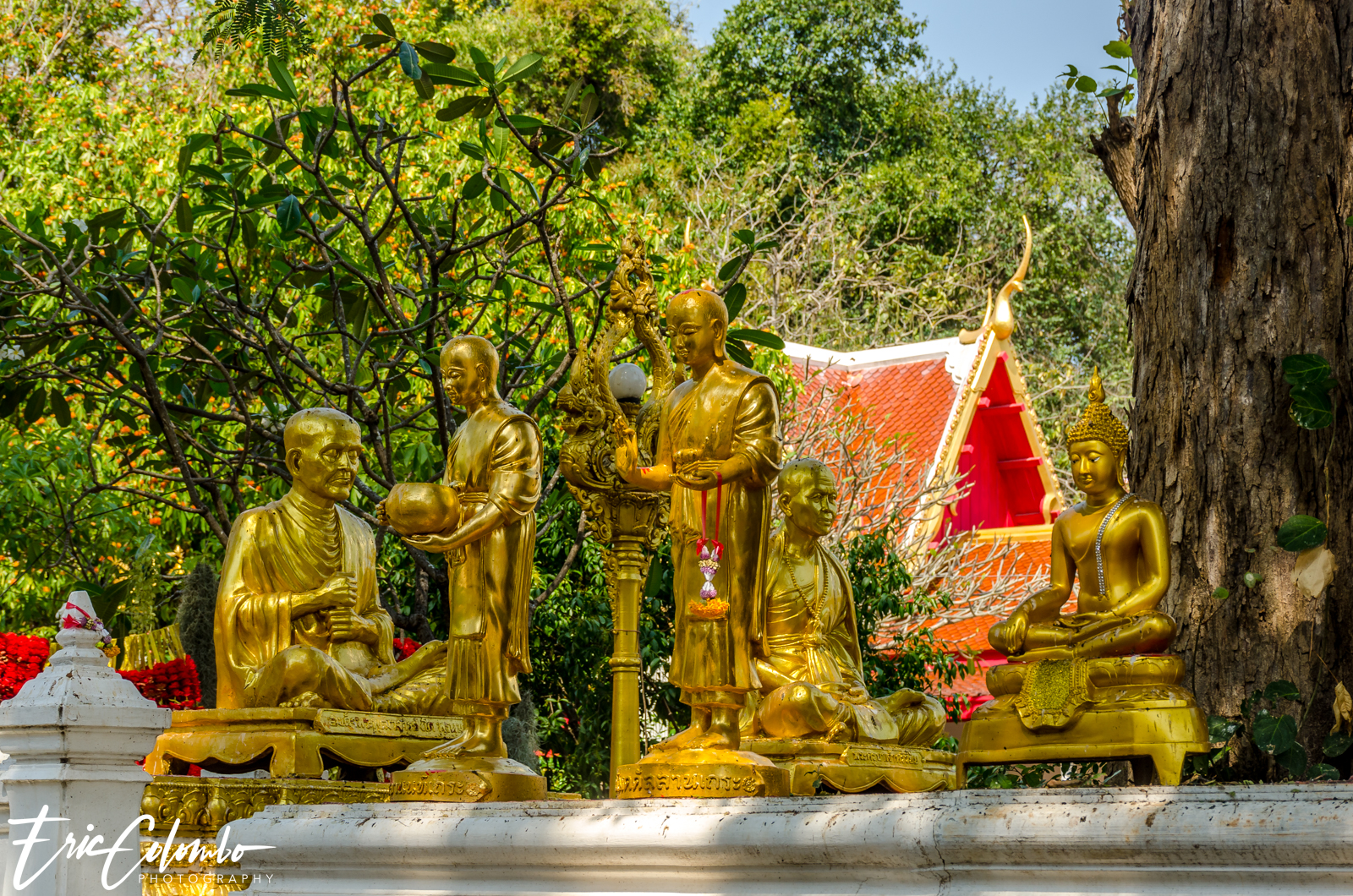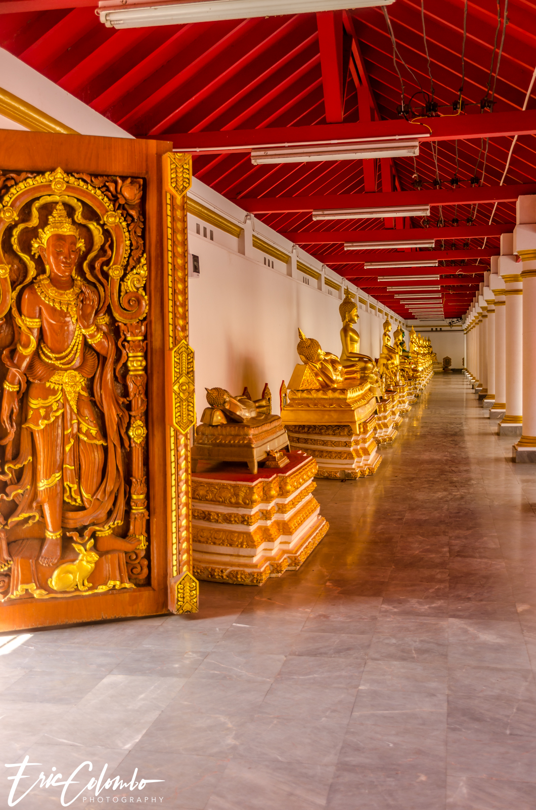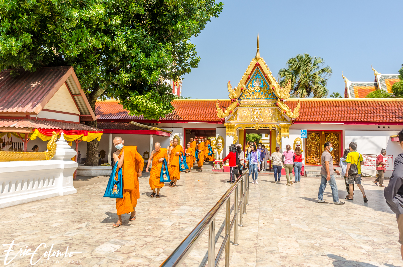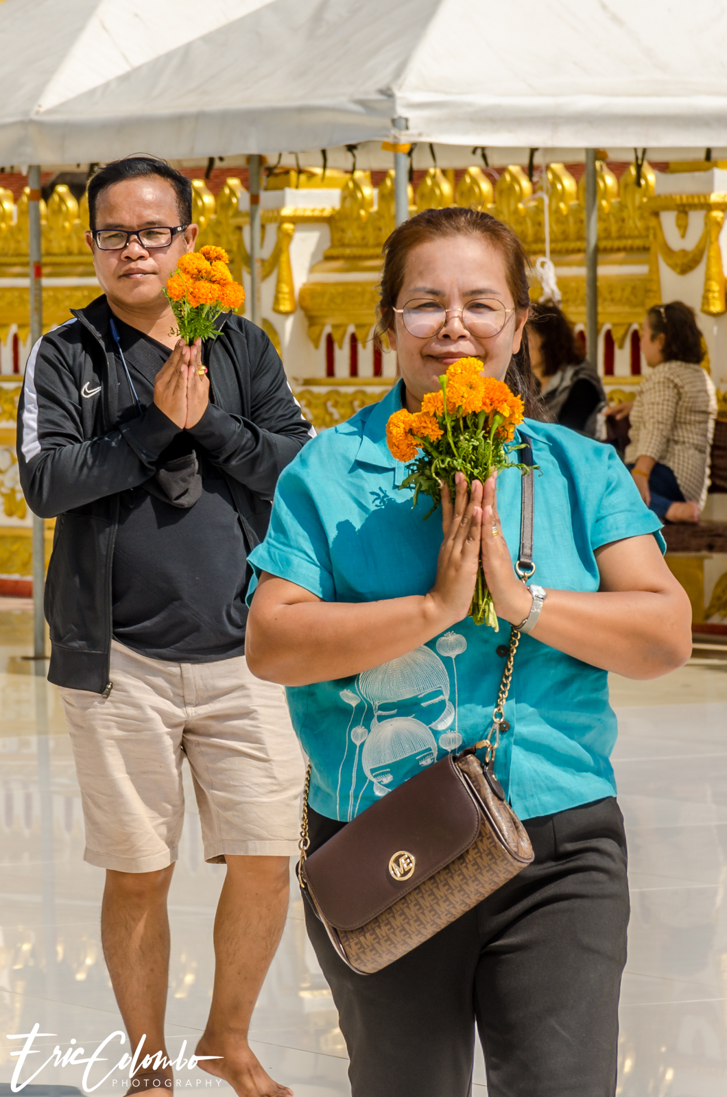 Le temple, de style laotien, avec un chédi(1) qui s'éleve à 57 mètres dans le ciel et qui possède 110 kilogrammes d'or dans sa conception, a été accepté à titre préliminaire comme candidat sur la liste des sites considérés comme sites du patrimoine mondial de l'UNESCO cette année. Ce temple offre une autre particularité que je n’ai jamais vu ailleurs, la surface autour du chédi est composée de plaque de marbre blanc. Avec le soleil, il serait impossible de marcher dessus sans se brûler la plante des pieds, mais ils ont installé un système de refroidissement sous les plaques; vous marchez sur un sol très frais, très agréable.